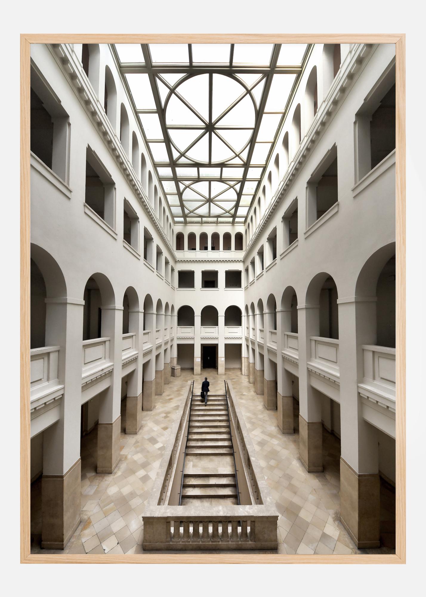 Un poster magnific cu clădirea lui Peter Behrens. Interiorul bej și alb surprinde o figură care urcă scările. Acoperișul transparent luminează detaliile arhitecturii cu ferestre circulare și pătrate care lasă lumina să strălucească prin ele. Creează o atmosferă elegantă cu acest imprimeu fantastic.