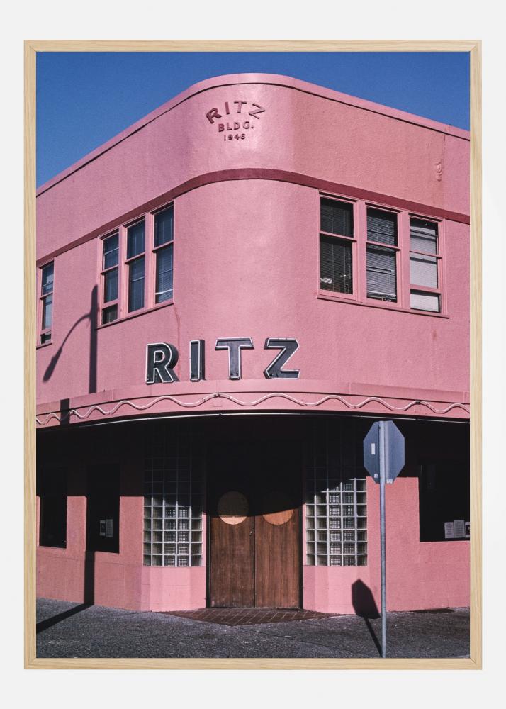 Un poster colorat cu clădirea cu două etaje Ritz de culoare roz. Cerul albastru închis evidențiază clădirea roz închis și ușa de intrare maro închis. Lumina soarelui reflectă umbra unui stâlp de lampă și a unui semn de stradă pe fațada clădirii. Un imprimeu perfect pentru toți cei care iubesc anii 1940.