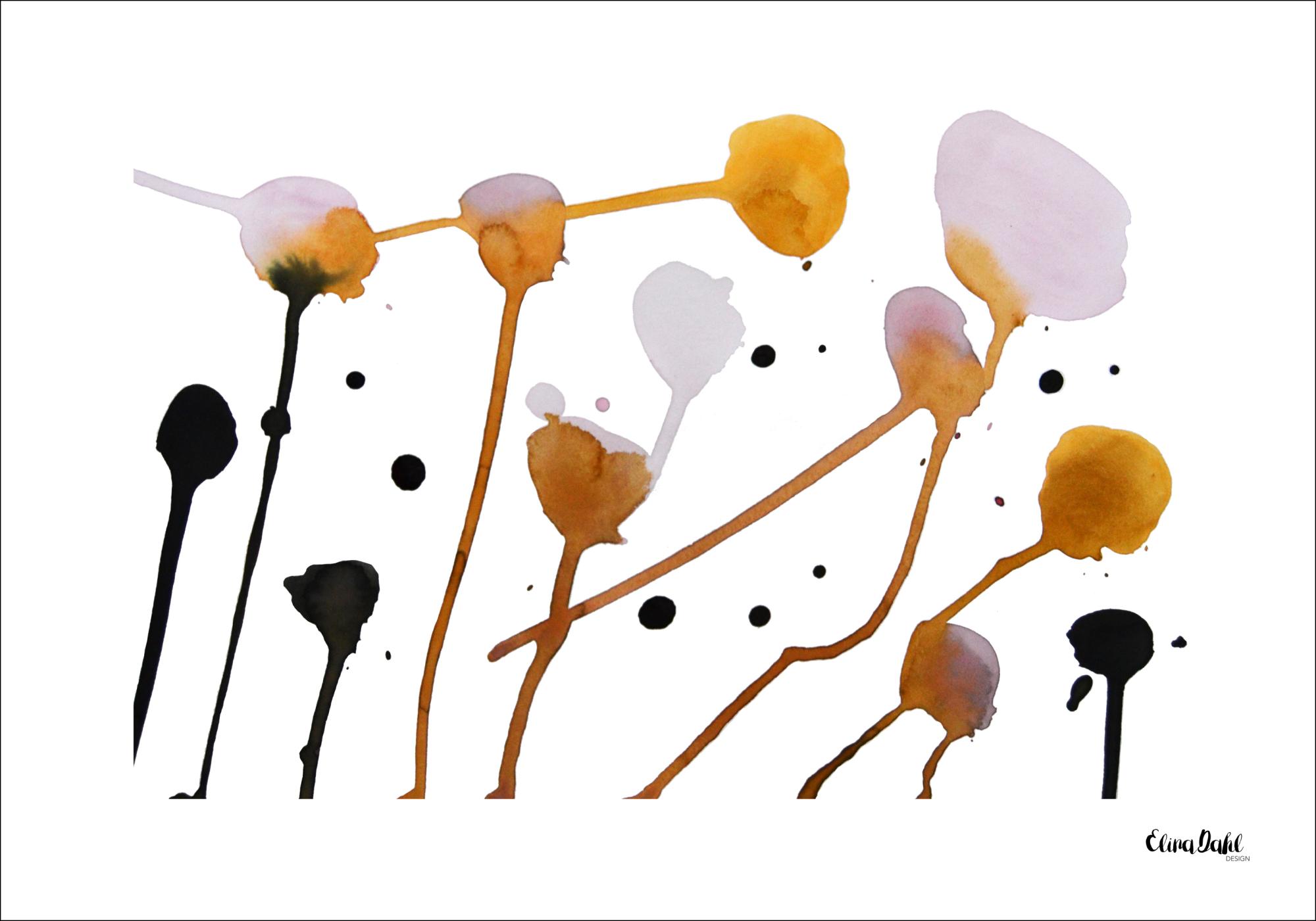 Un poster botanic cu tulpini de flori portocalii, roz și negre. Pictate pe o suprafață albă, tulpinile florale de diferite culori au fost plasate aleatoriu, iar între tulpini au fost stropite puncte negre. Pentru un aspect elegant, poți adăuga acest poster pe un perete neutru.