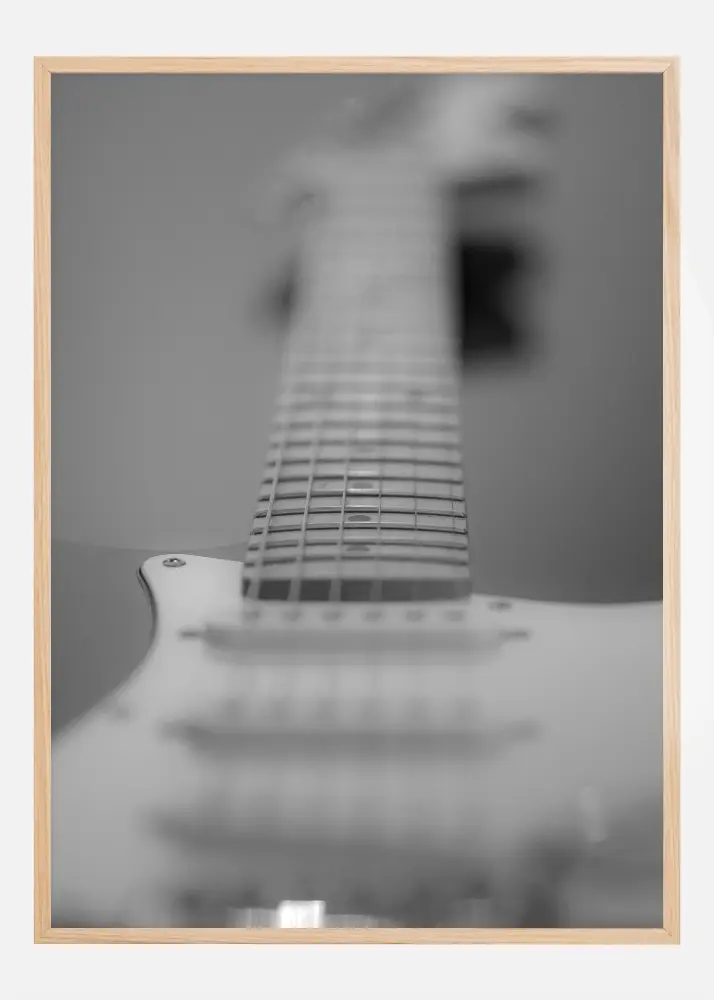 Această poster artistică captează esența muzicii și a pasiunii printr-o imagine detaliată și profundă a unei chitare. Cu un accent pe suportul de corzi și gâtul chitarei care se întinde în sus spre o siluetă neclară a corpului chitarei, această imagine creează o perspectivă puternică și adâncime. Fotografia este în alb și negru, oferind un sentiment clasic și atemporal, în timp ce cadrul de lemn din jurul motivului adaugă o atingere caldă și naturală.