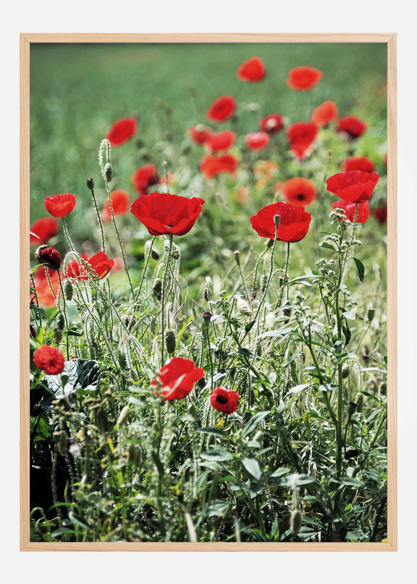 Un frumos imprimat de aproape al unui câmp de maci. Iarba verde închis intensifică culorile vii ale florilor de mac și creează o senzație proaspătă. Florile de mac stau drepte pe câmp în timp ce iarba crește în jurul lor. Un poster relaxant și minunat de agățat în dormitorul tău.