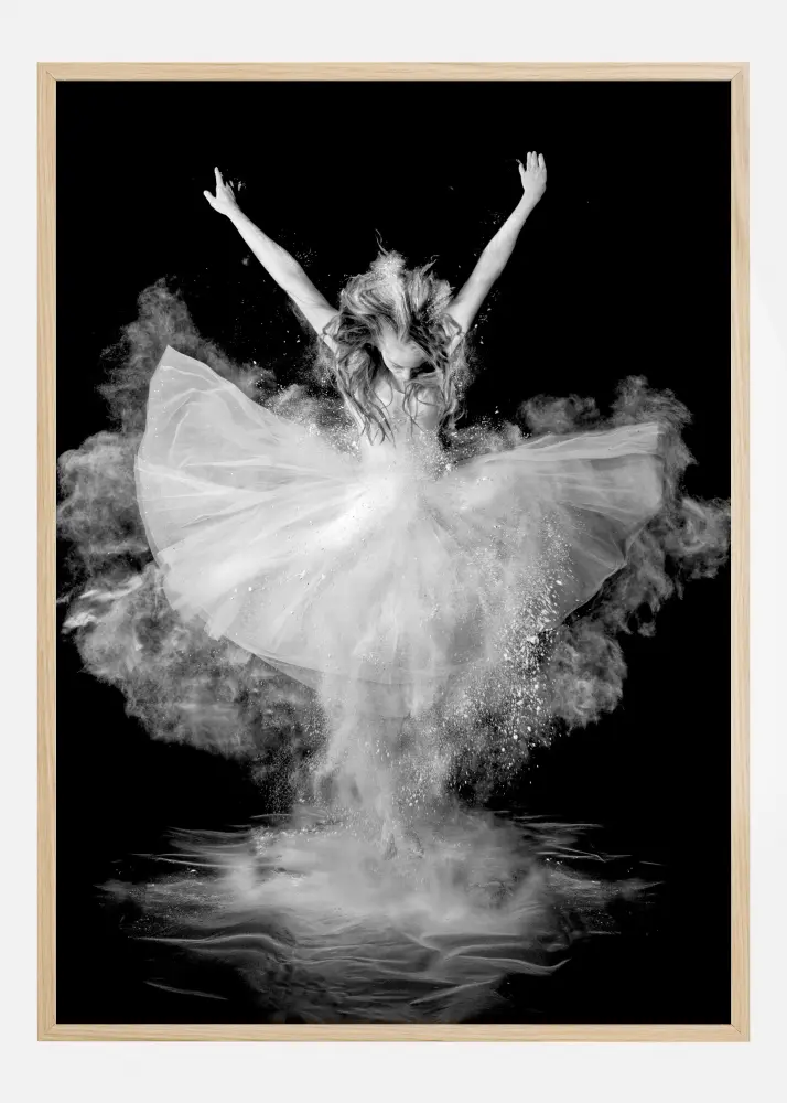 O imagine magnifică în alb și negru a unui dansator. Pe un fundal negru, dansatorul pare să evolueze pe apă. Cu rochia albă de balet desfășurată, praf alb cade din rochie și se reflectă frumos în apă. Un imprimeu magnific de agățat în casa ta.