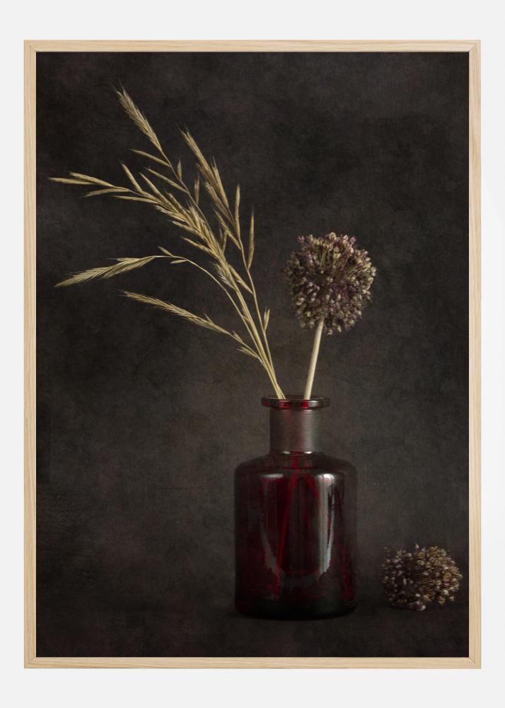 Un imprimeu frumos, dar simplu, al două fire de iarbă uscată într-un borcan de sticlă. Pe un fundal maro închis, ierburile de culoare galbenă sunt așezate într-un borcan roșu. În dreapta vazei se află încă un fir de iarbă uscată. Un poster frumos care adaugă puțină culoare pe un perete alb.