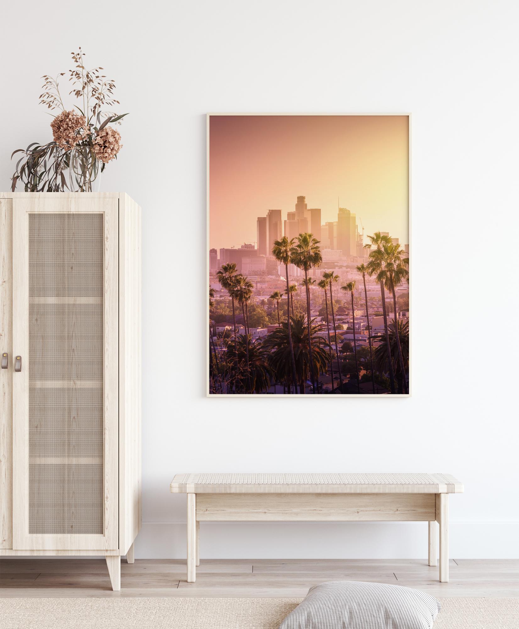 O imprimare a unui oraș luat de la distanță. În prim-plan, palmierii înalți domină imaginea, în timp ce zgârie-norii din depărtare privesc orașul. Cerul portocaliu și violet se reflectă pe clădirile orașului, oferindu-le un aspect violet. Un poster perfect pentru toți cei care iubesc arhitectura.