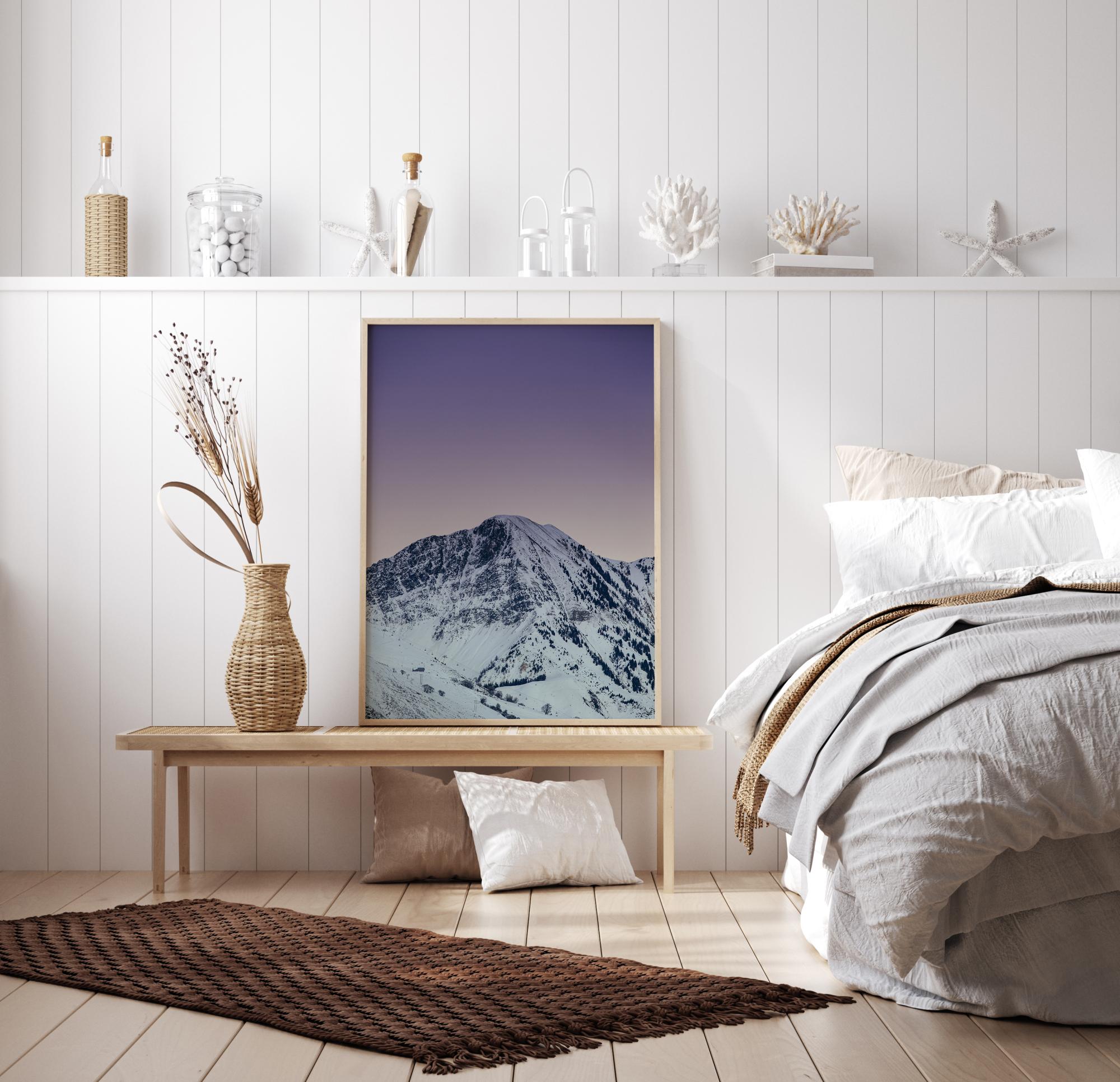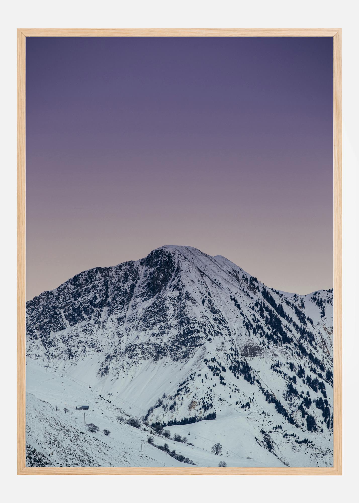Un poster cu o noapte înstelată deasupra unui munte masiv alb. Acest munte impresionant acoperit de zăpadă este plasat sub un cer mov fantastic. Cerul mov se reflectă pe vârfurile munților și creează o senzație caldă în imprimare. O imagine frumoasă de agățat într-un mediu rece.