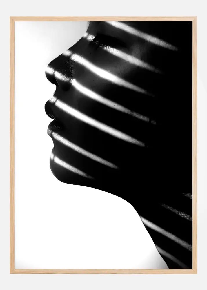Un poster minunat de portret care surprinde lumina care cade pe fața și gâtul unei femei. Femeia are ochii închiși pe un fundal alb. Lumina naturală care străbate obloanele ferestrelor creează o senzație de căldură. Un imprimeu perfect de agățat într-un salon de înfrumusețare.