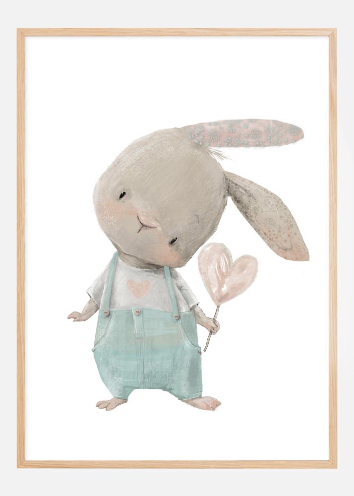 Această poster adorabilă prezintă un iepuraș mic care ține un balon în formă de inimă, realizat cu finețe și sensibilitate prin pictură în acuarelă. Privirea blândă și visătoare a iepurașului și detaliile fine ale hainelor sale, care includ modele florale în culori pastel, conferă o senzație de inocență și puritate. Această ilustrație este un omagiu încântător adus dragostei și grijii, evocată de balonul în formă de inimă.