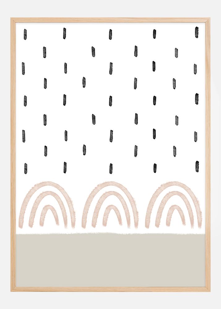 Această afiș artistic, "Rain on Rainbows", combină ludicitatea și minimalismul într-un mod unic. Motivele prezintă un fundal cu curcubee în acuarelă în nuanțe blânde de teracotă pe o bază albă pură. Peste aceste arce moi se vede o colecție de trăsături de pensulă abstracte, asemănătoare ploii, plutind într-o simetrie dezordonată. Culorile curcubeelor contrastează frumos cu "picăturile de ploaie" negre de cerneală, creând o imagine dinamică, dar totuși armonioasă.