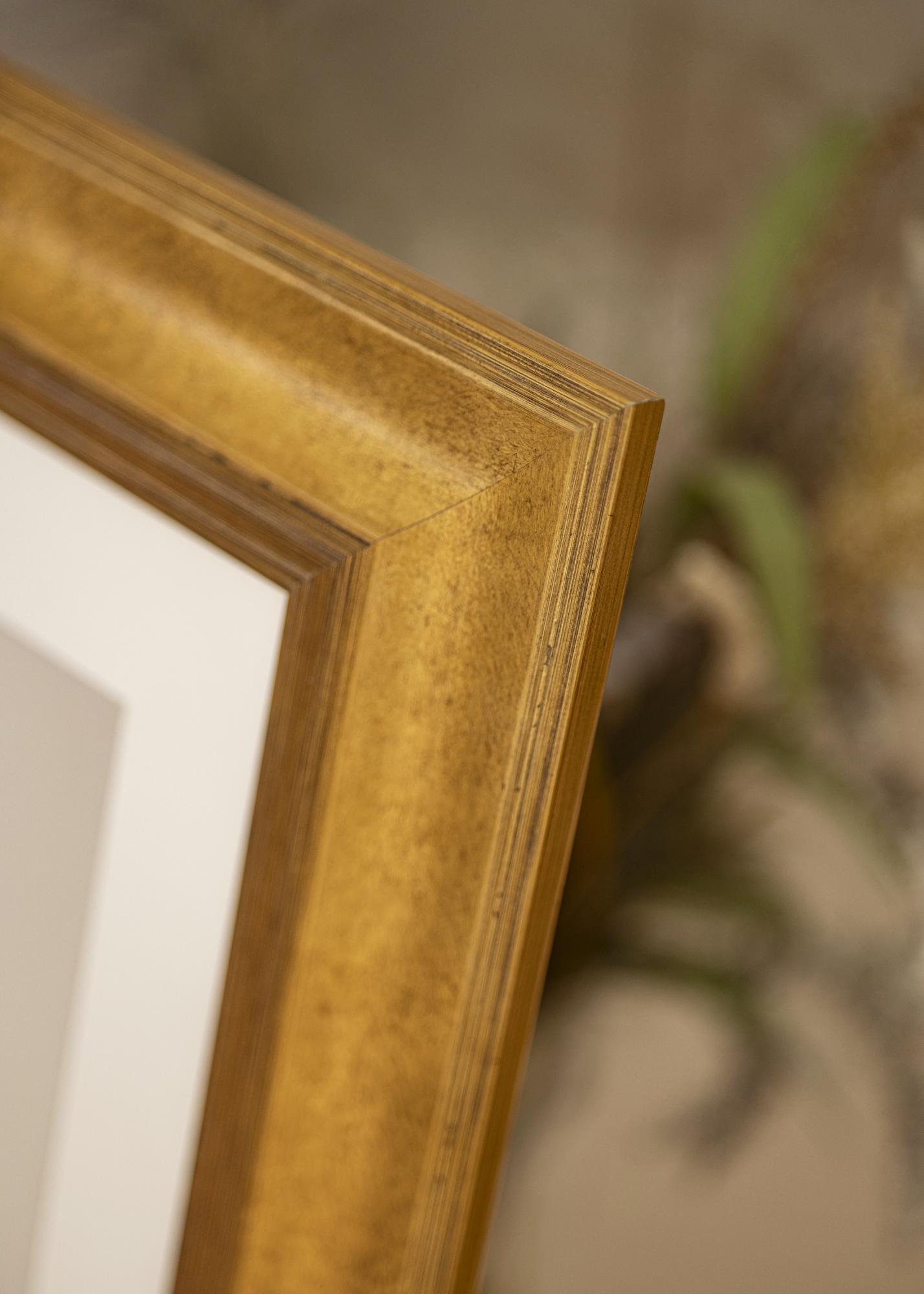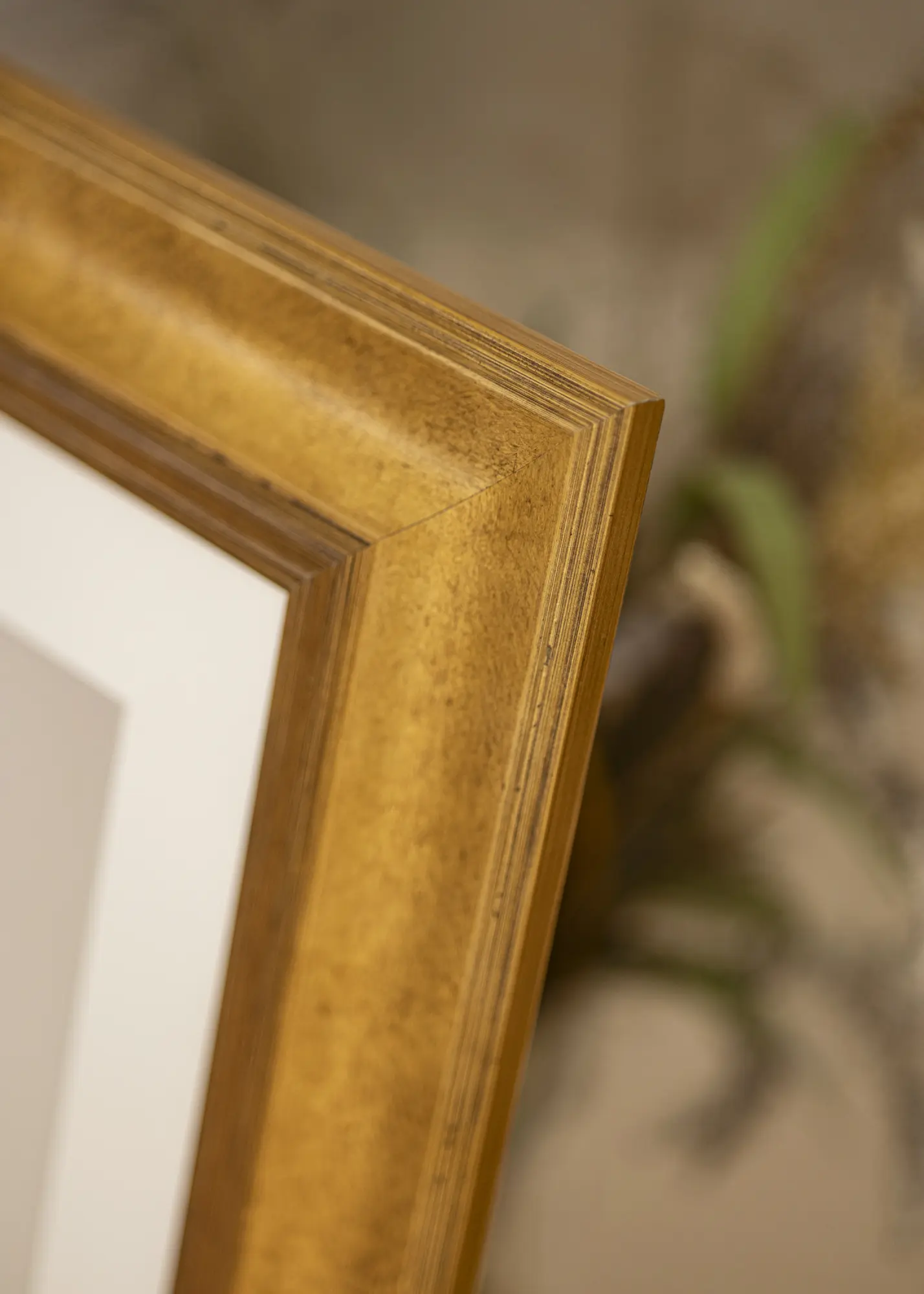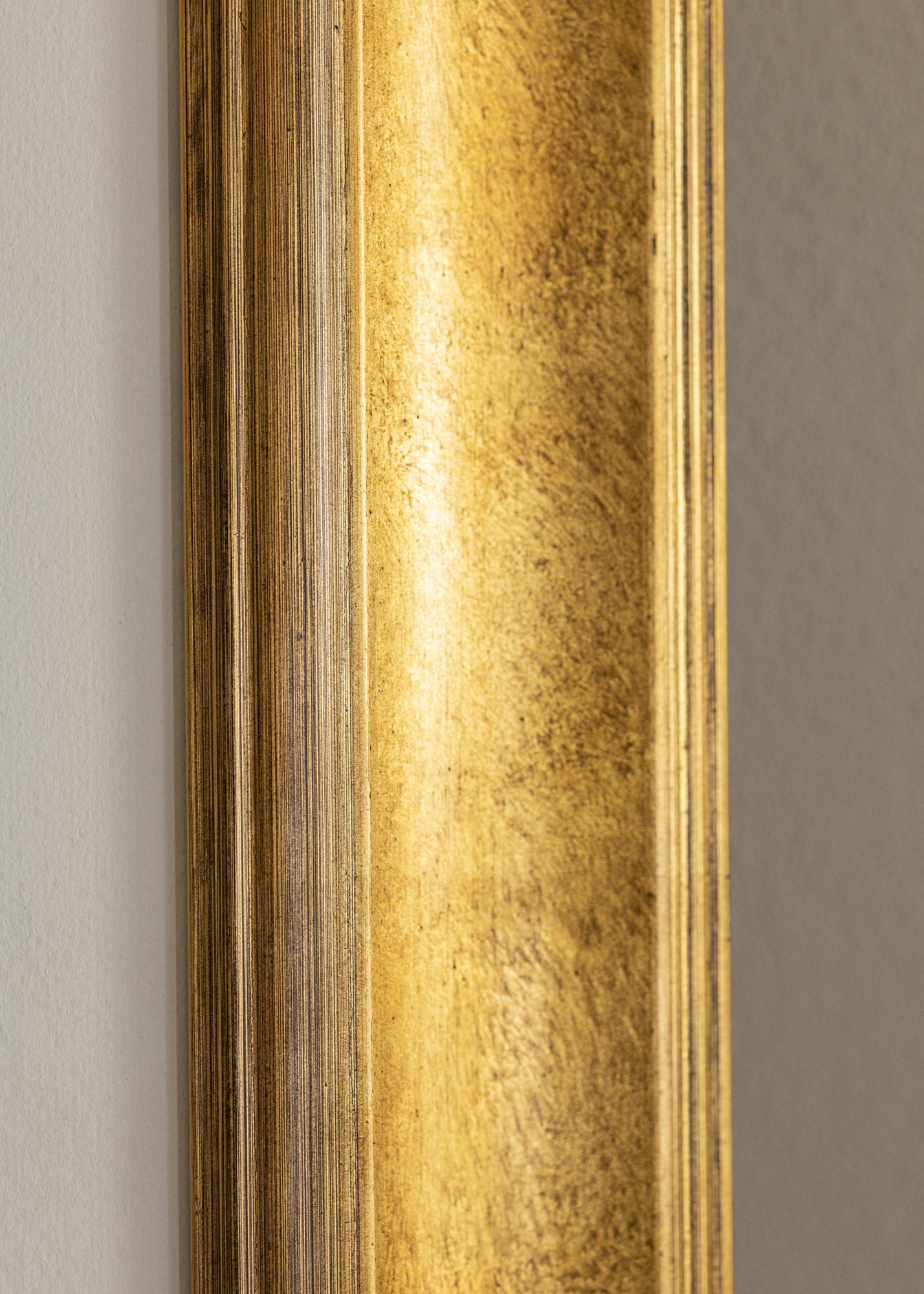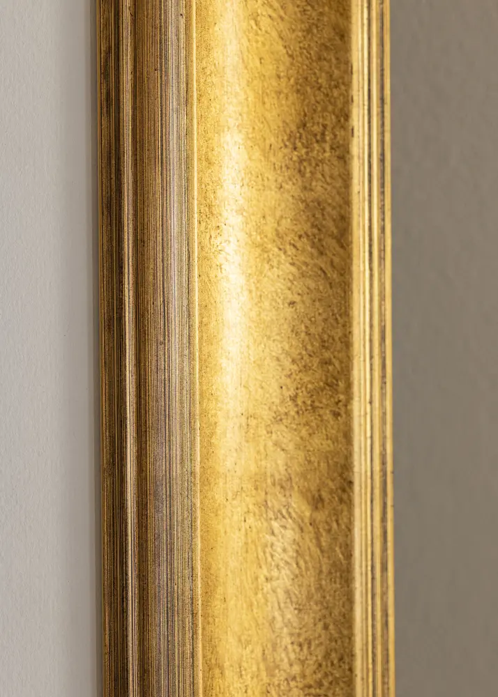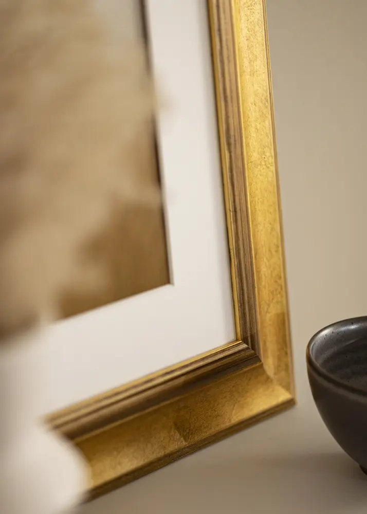 Rama este fabricată din pin și are linii subțiri de-a lungul marginilor care adaugă o bogăție sofisticată de detalii. Nuanța caldă de aur oferă o eleganță atemporală care se potrivește perfect atât în decoruri moderne, cât și tradiționale. Deoarece fiecare ramă este realizată pe comandă în propriul nostru atelier, poți fi sigur că vei primi un produs personalizat conform nevoilor tale specifice.