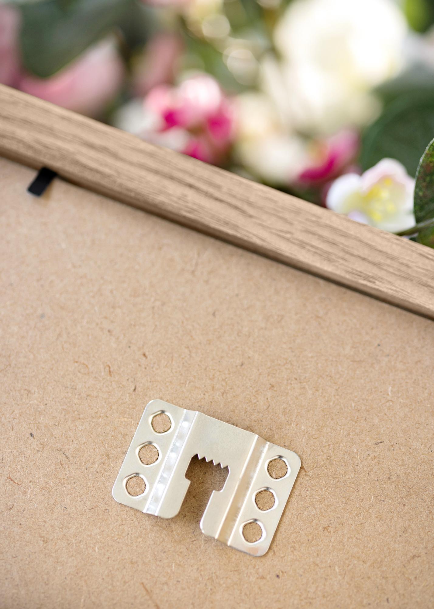 Această ramă accesibilă este fabricată din MDF și are un finisaj mat care completează finisajul natural din stejar. Este echipată cu agățătoare metalice pe spate pentru o agățare ușoară și se montează simplu cu ajutorul cleștilor flexibili. Indiferent dacă alegi să o așezi pe un raft sau să o atârni pe perete, această ramă foto va aduce în casa ta o notă de clasă și căldură. Disponibilă și în mai multe dimensiuni pentru a se potrivi tuturor nevoilor tale de înrămare.