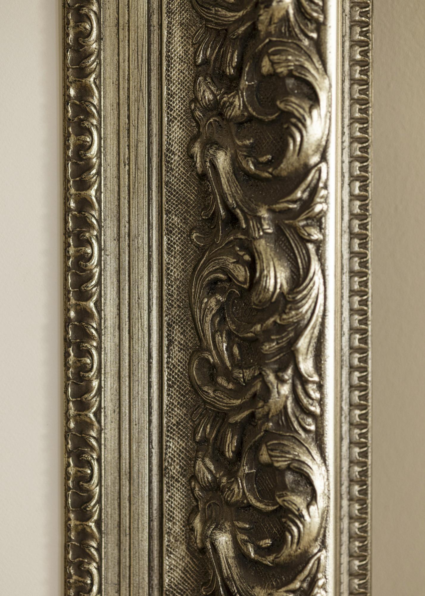 Această ramă bogat ornamentată în argint antic are detalii intricate și o patină frumoasă care oferă o senzație de eleganță și atemporalitate. Relieful profund evidențiază modelele sculptate de frunze, făcând-o o alegere perfectă pentru motivele clasice și încadraturile care necesită o ramă distinctă și decorativă.