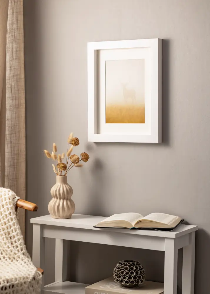 Cadrul din lemn de pin fabricat în Finlanda, vopsit alb direct pe lemn pentru a oferi un aspect autentic. "Boxholm Alb" are o adâncime de 43 mm, perfectă atunci când dorești să înrămezi diferite tipuri de obiecte. Sau dacă doar dorești ca înrămarea să iasă puțin de pe perete. La cadru este inclusă o listă de distanțare care îți permite să alegi între două adâncimi pentru înrămare.