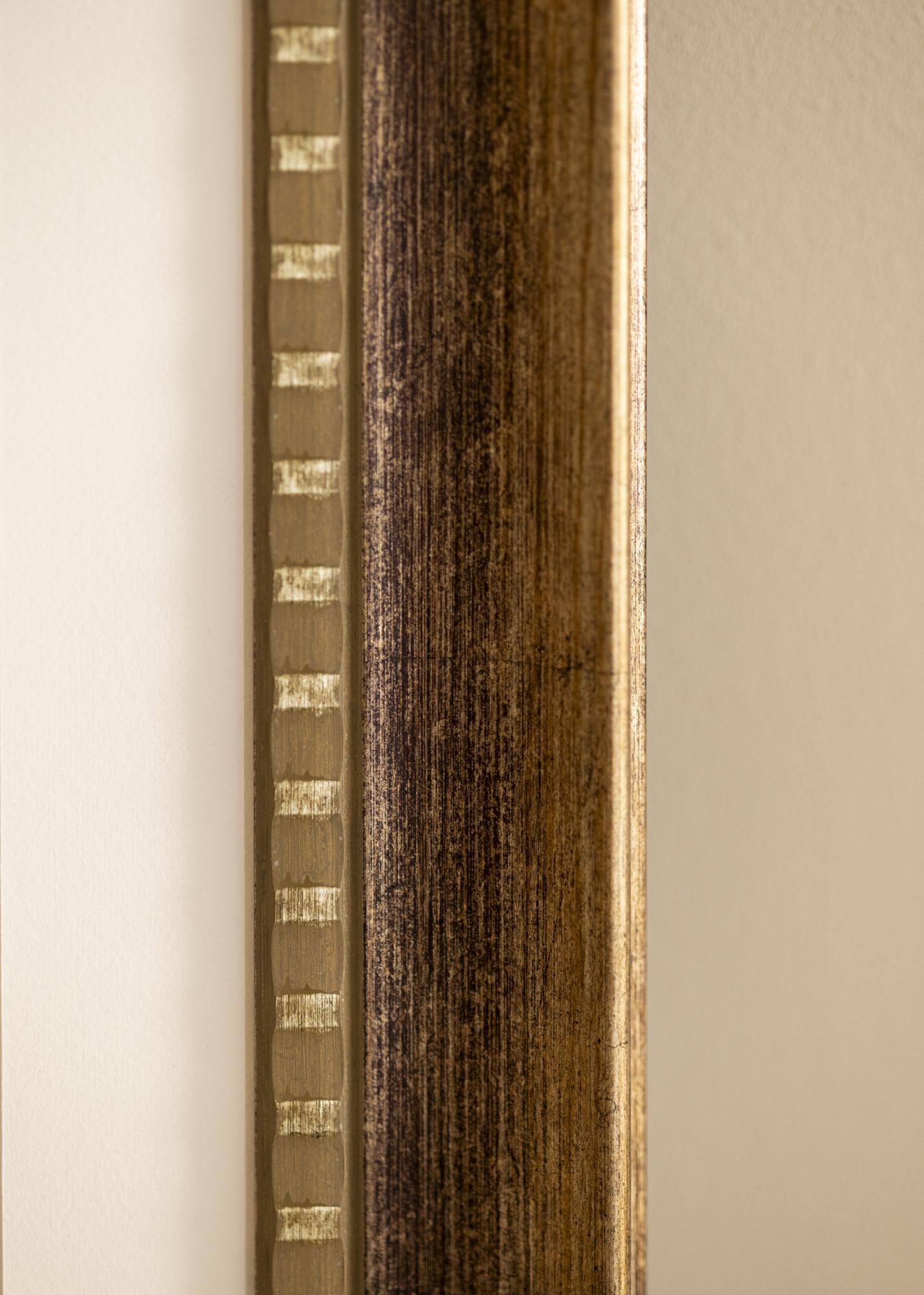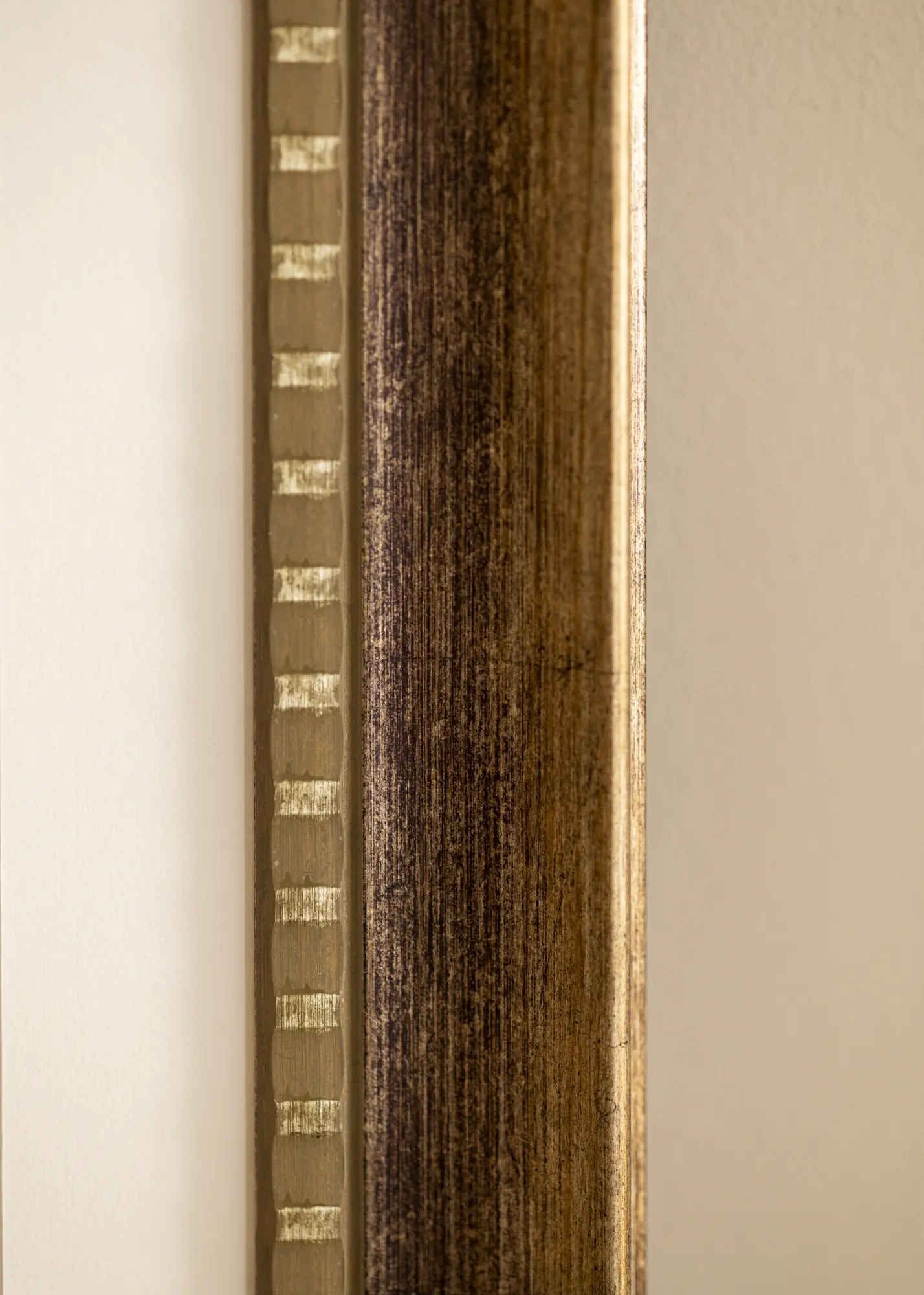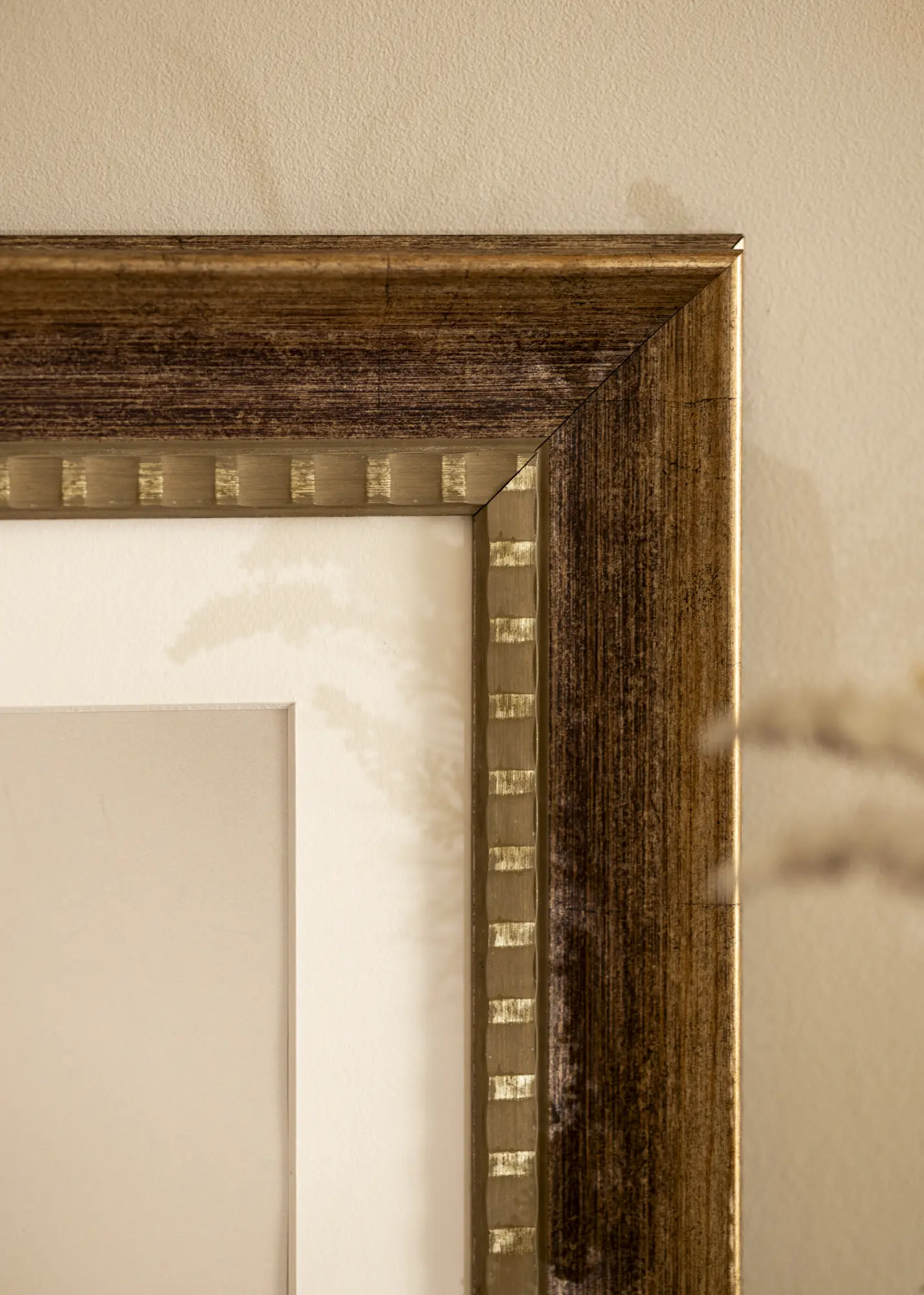 Camden Argintie are o culoare brună caldă cu un finisaj antic subtil care îi conferă un caracter rustic. Suprafața este prevăzută cu o ușoară granulație care imită lemnul natural, întărind expresia sa vintage. Marginea interioară decorativă este împodobită cu mici detalii aurii regulate care creează un contrast elegant cu nuanța mai închisă a lemnului. Marginea exterioară are o fasoare moale cu un finisaj discret auriu, oferind ramei o senzație luxoasă și atemporală.