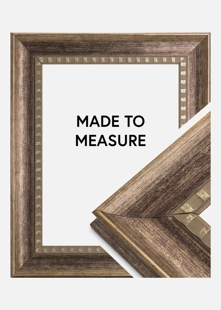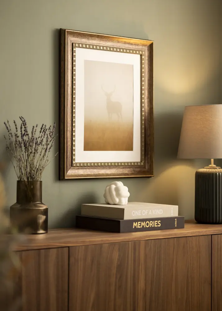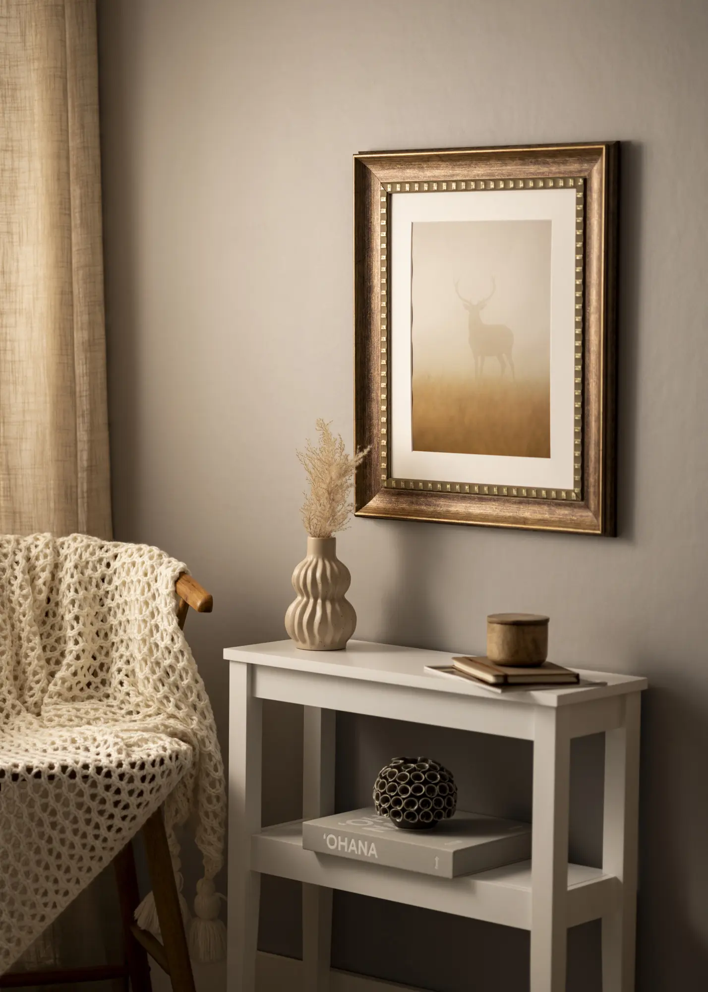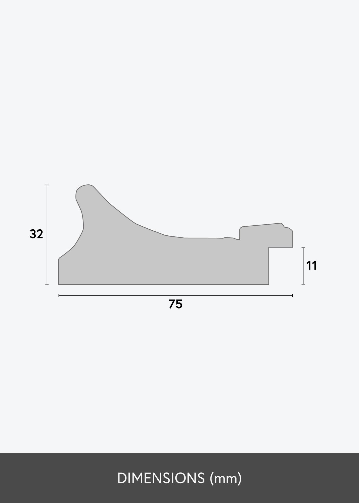 Camden Argintie are o culoare brună caldă cu un finisaj antic subtil care îi conferă un caracter rustic. Suprafața este prevăzută cu o ușoară granulație care imită lemnul natural, întărind expresia sa vintage. Marginea interioară decorativă este împodobită cu mici detalii aurii regulate care creează un contrast elegant cu nuanța mai închisă a lemnului. Marginea exterioară are o fasoare moale cu un finisaj discret auriu, oferind ramei o senzație luxoasă și atemporală.