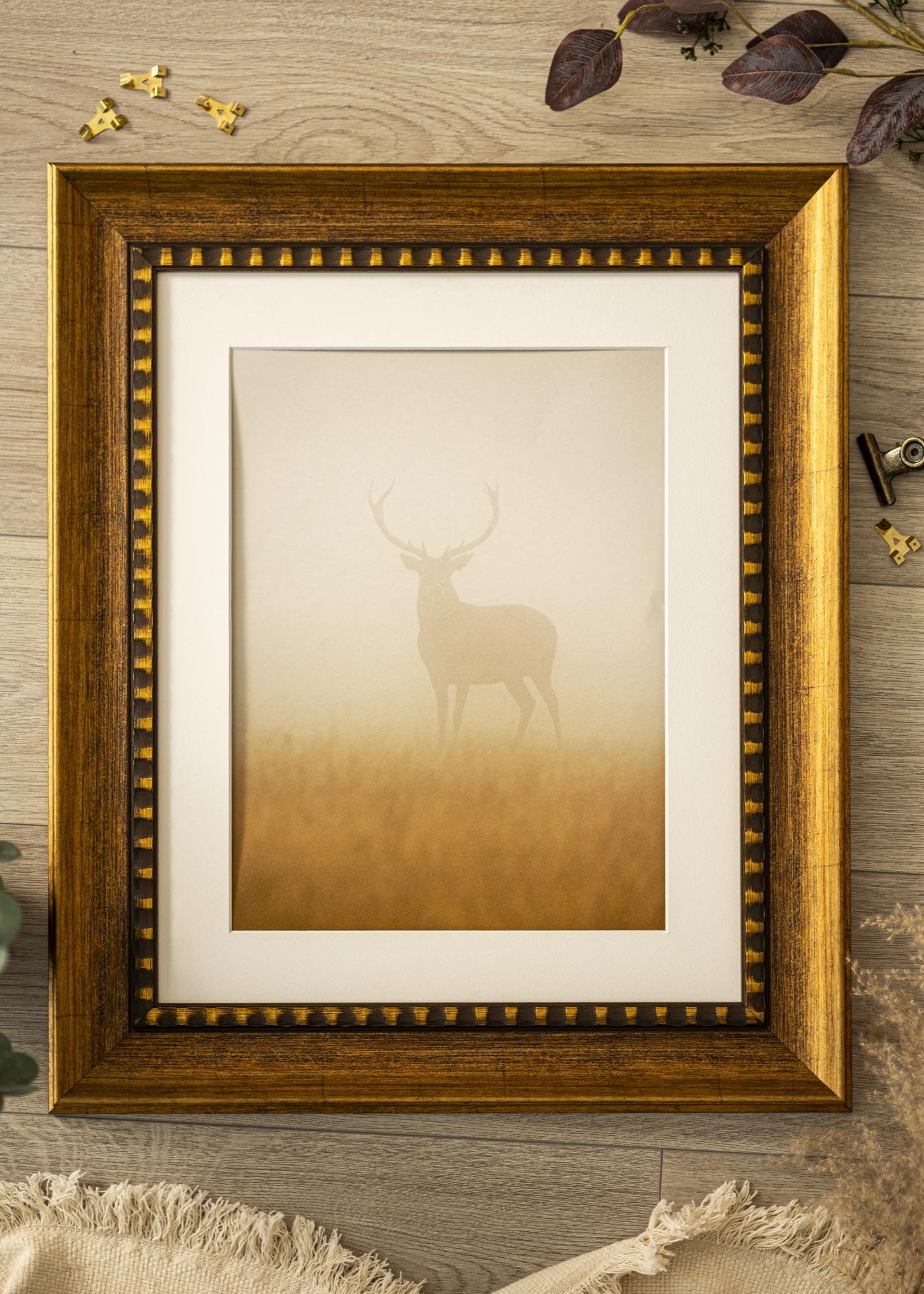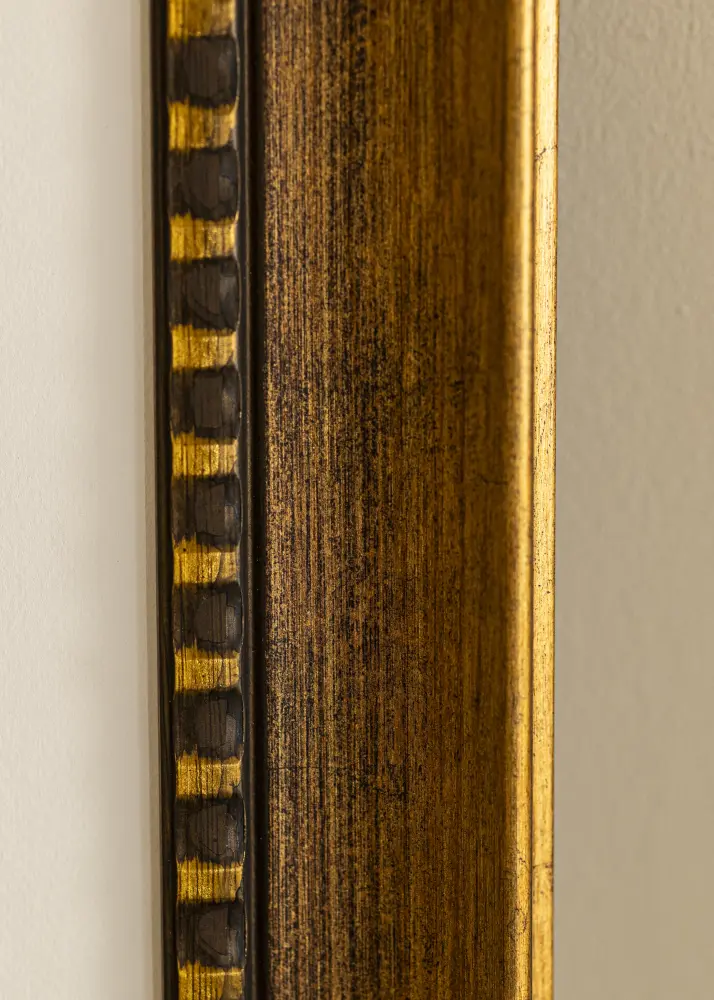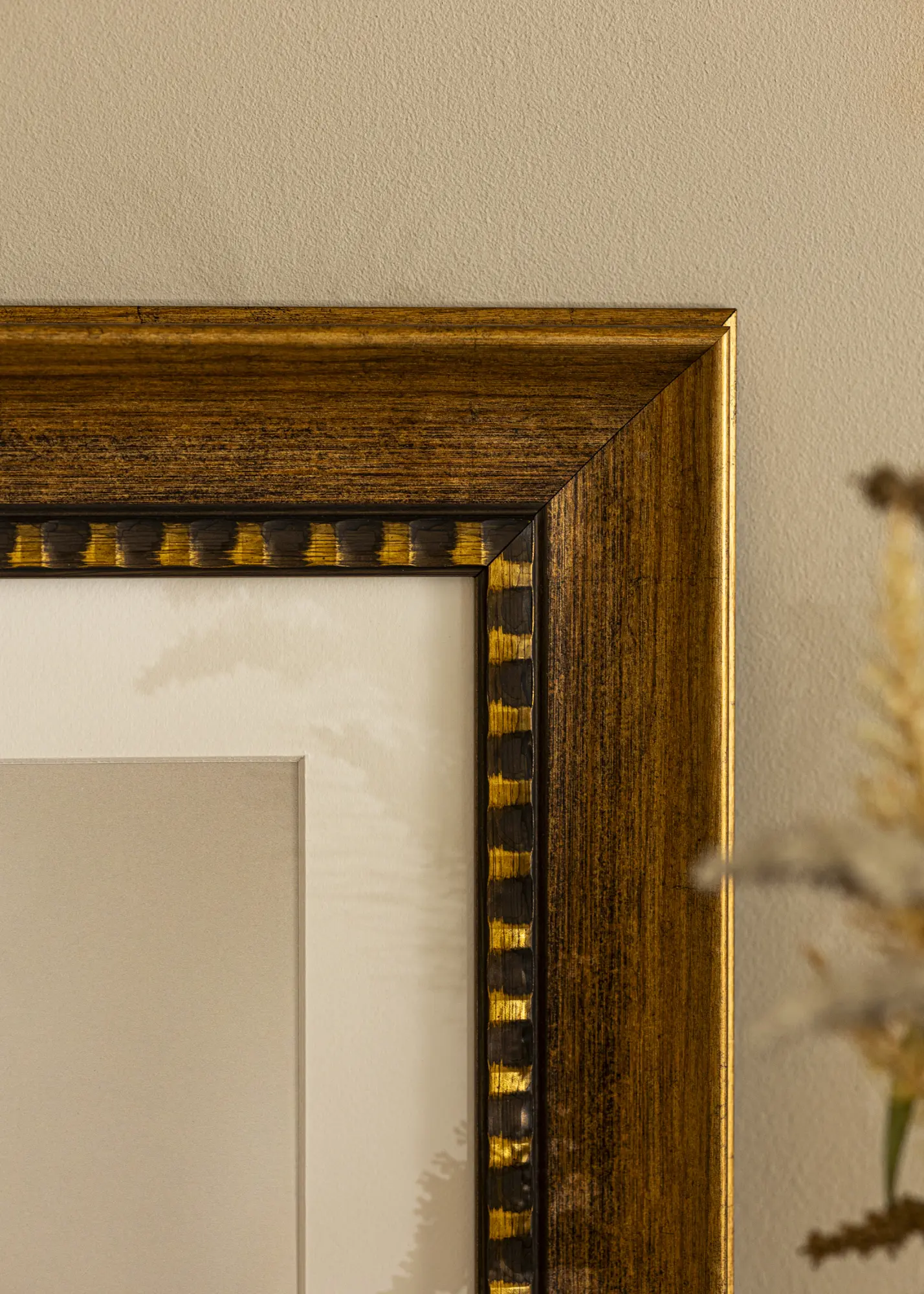 Lista de ramă, lată de 75 mm, are o strălucire subtilă și este decorată cu un detaliu distinct dungi aurii și negre de-a lungul marginii interioare. Acest lucru conferă ramei un caracter unic și o face perfectă pentru a evidenția operele de artă clasice și tradiționale. Structura din lemn este vizibilă și contribuie cu o senzație rustică, în timp ce marginea moale aurie adaugă o notă de eleganță.