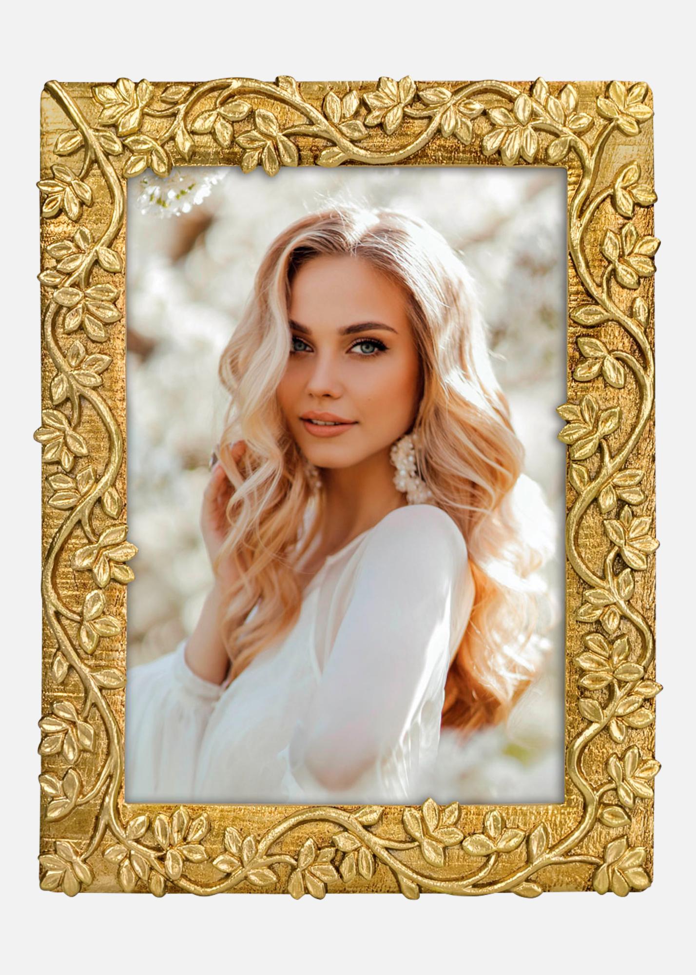 Oferă fotografiilor tale preferate un cadru regal cu această ramă portret de culoare aurie. Cu decorațiunile sale florale meandrate, fiecare fotografie devine o operă de artă în sine. Dimensiunea ramei este de 13x18 cm, perfectă pentru a evidenția momentele tale cele mai iubite.
