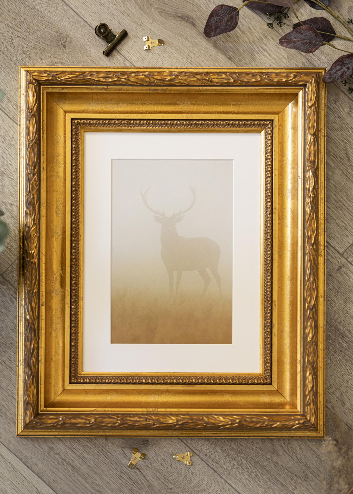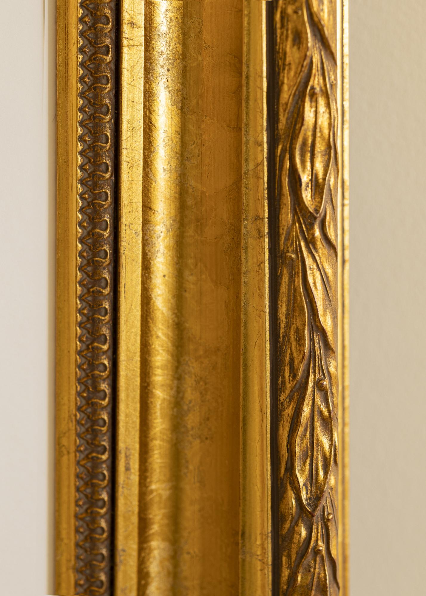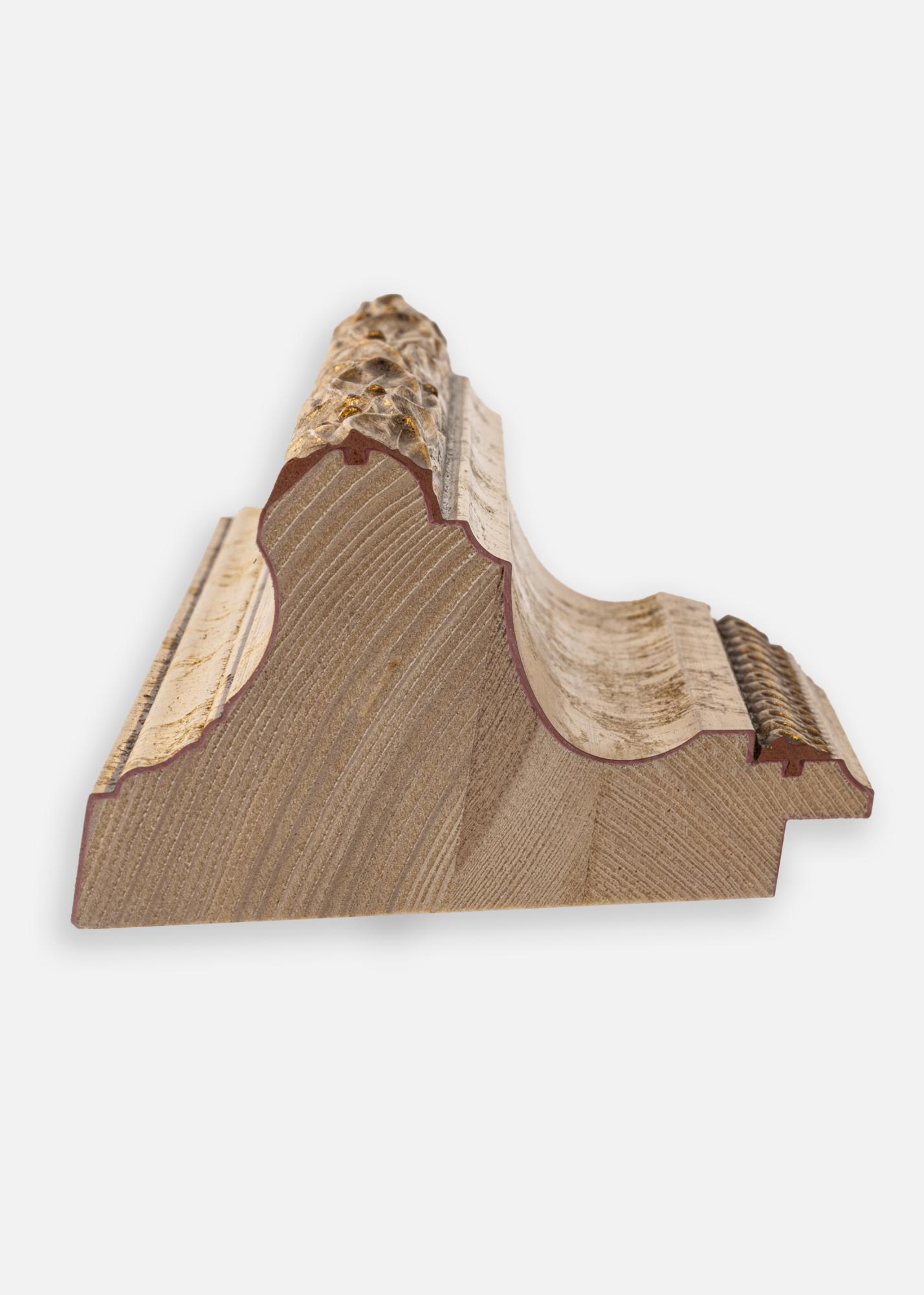 Profilul său larg de 102 mm oferă ramului o prezență impresionantă, în timp ce adâncimea de 56 mm creează o încadratură robustă și stabilă. Ornamentațiile mici sub formă de perle de-a lungul marginii interioare oferă o notă subtilă și clasică ce îmbunătățește impresia de ansamblu. Marginea exterioară este împodobită cu un model ondulat de frunze, ceea ce adaugă o caracteristică sofisticată și atemporală ramei.