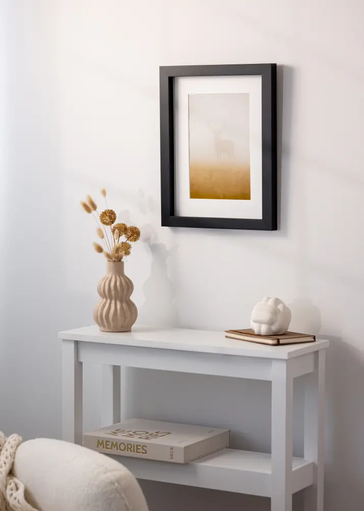 Această ramă de tablou are o listă de ramă de 30 mm lățime și o adâncime de 32 mm, creând un adâncime impresionantă între imagine și sticlă datorită listei de distanțare. Acest lucru face ca motivul să capete o dimensiune suplimentară și să iasă cu adevărat în evidență. Rama este realizată din lemn de pin, oferind o construcție stabilă și durabilă, menținând în același timp o greutate redusă.