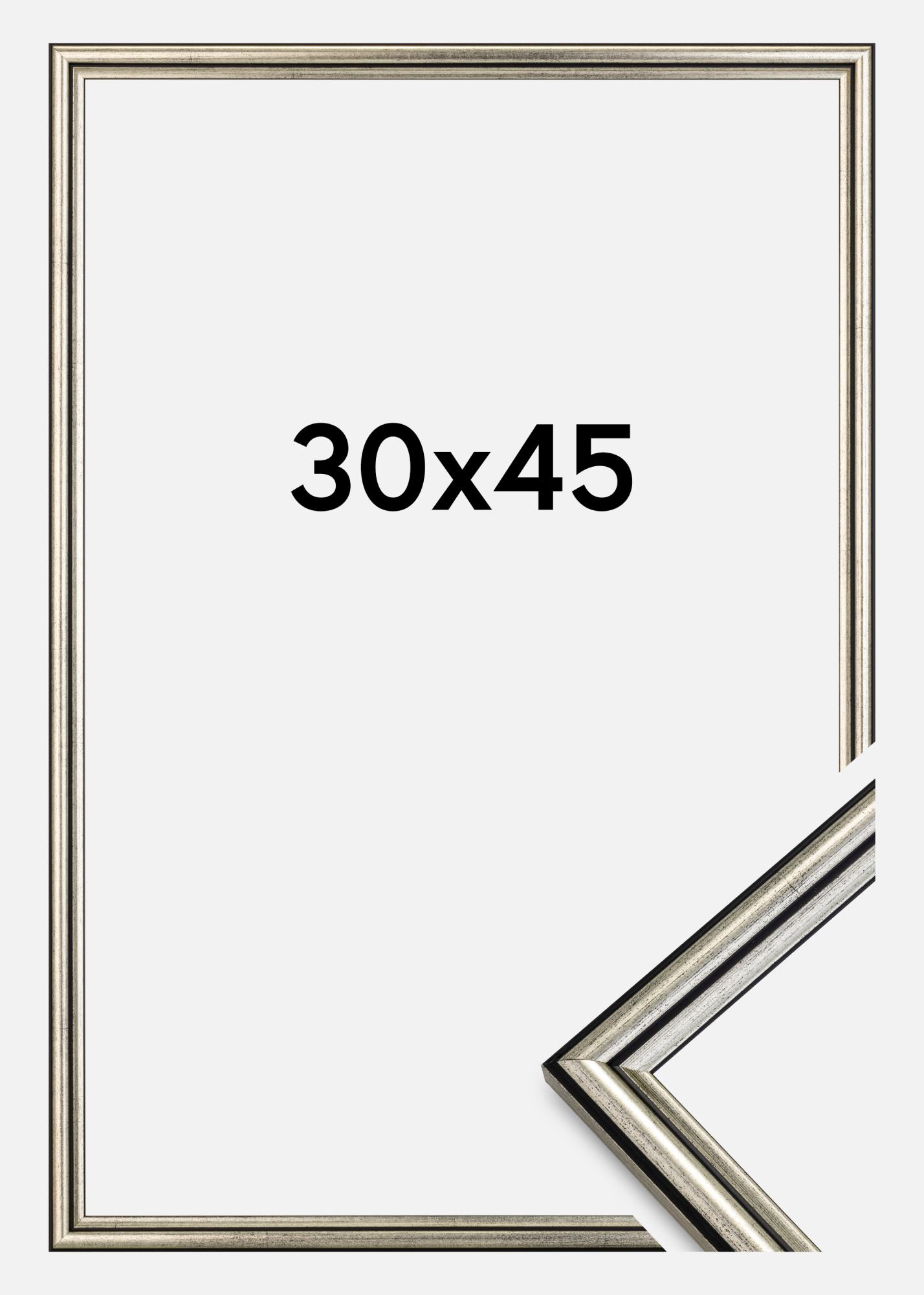 Descoperiți eleganța și designul sofisticat cu rama noastră de 30x45 cm de argintiu, perfectă pentru a evidenția fotografiile sau lucrările dvs. de artă preferate. Această ramă foto este un detaliu stilat în orice cameră, cu accentele sale subtile pătate negru și liniile negre care oferă o adâncime și un caracter unice.