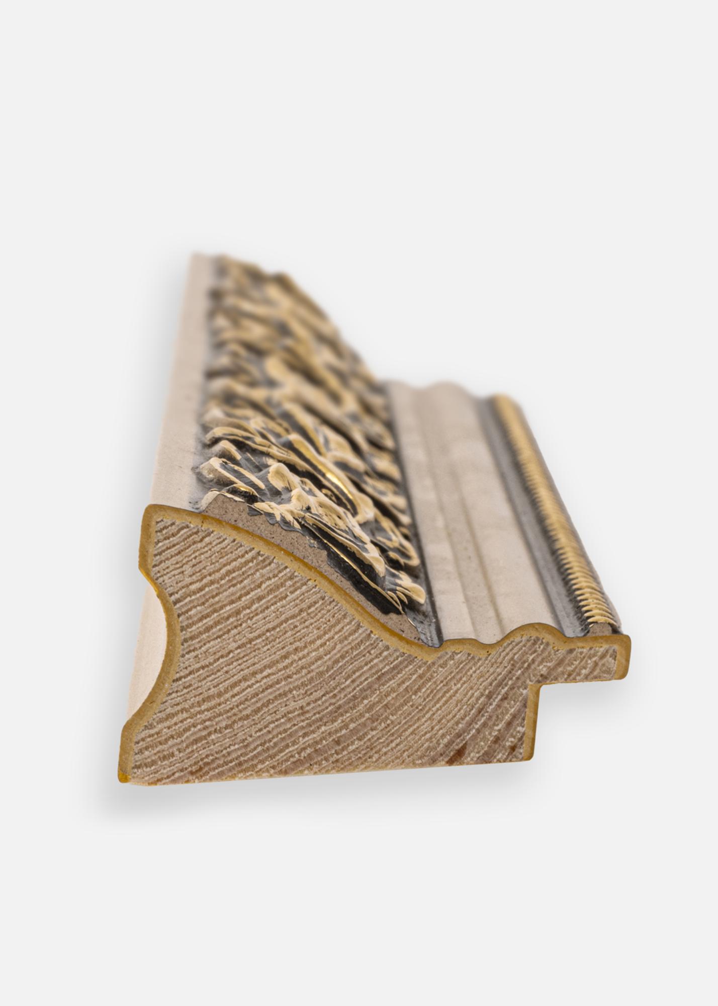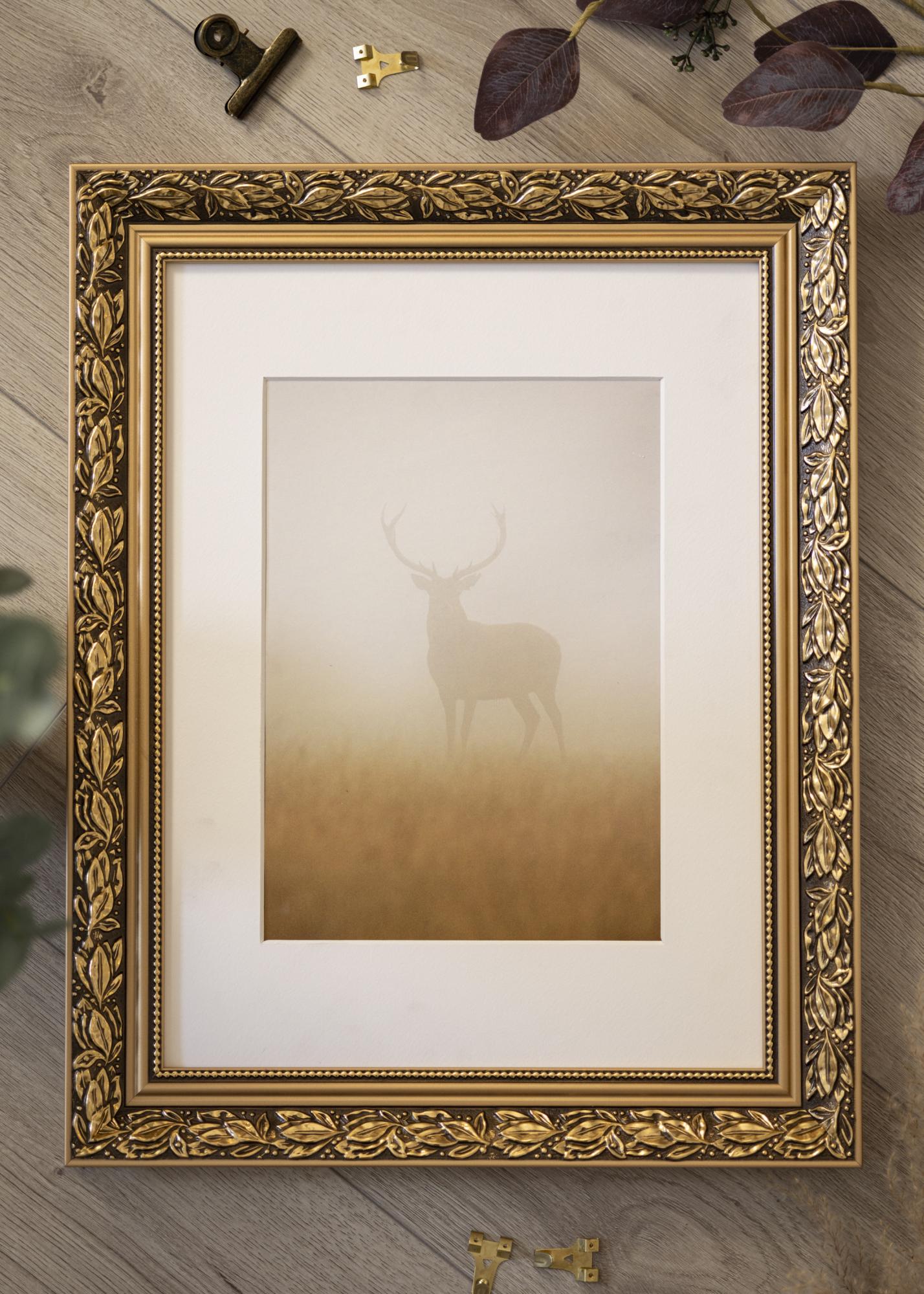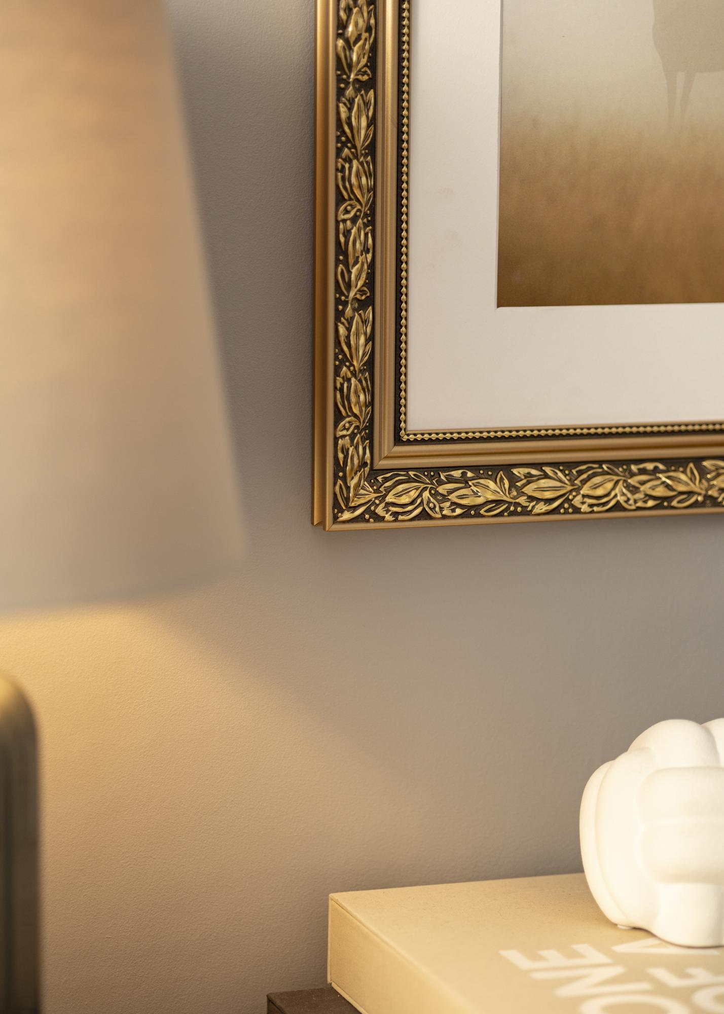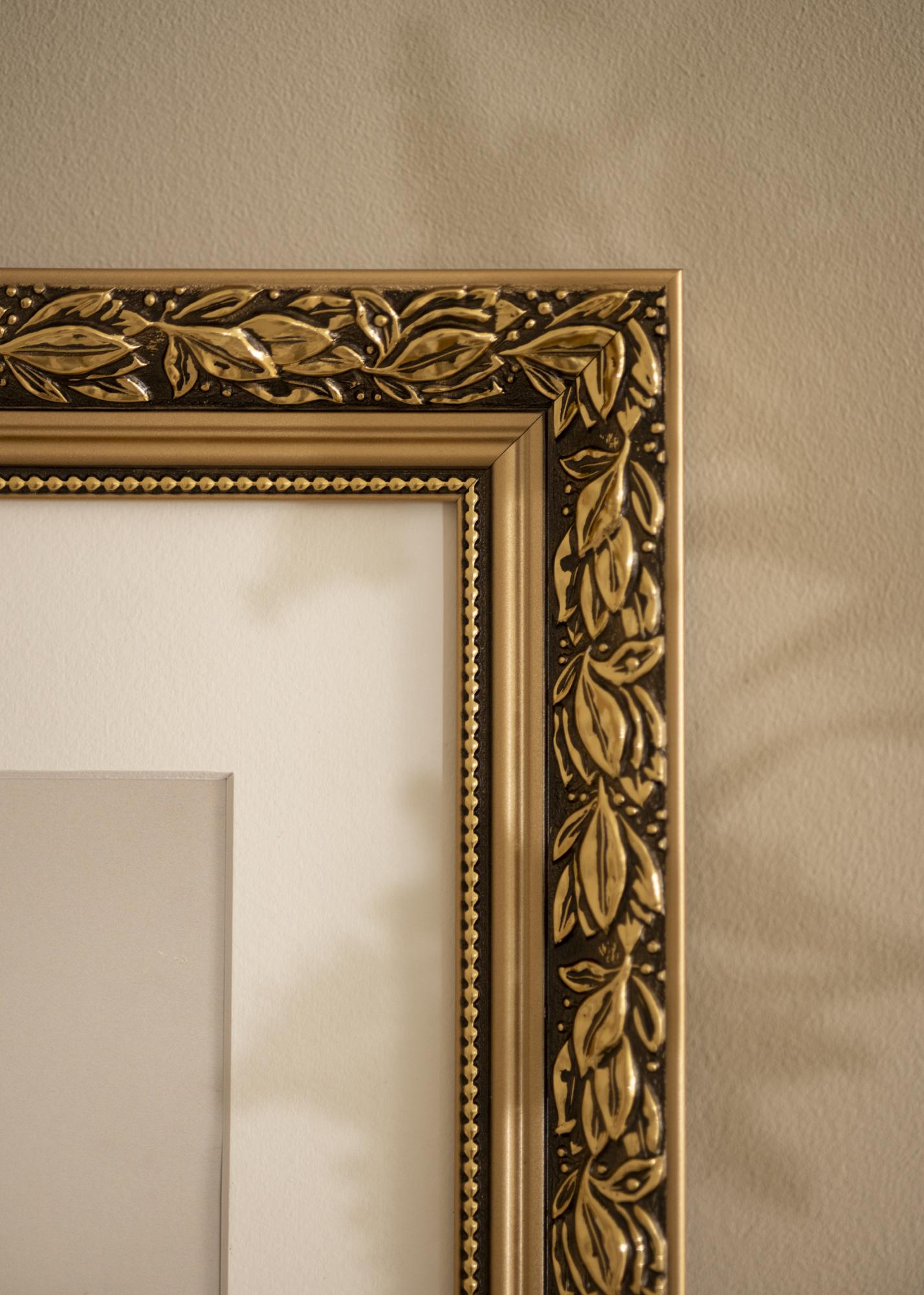 O imagine valoroasă merită o ramă frumoasă! Aici avem o ramă de tablou cu design romantic, cu margini aurii, modele elaborate de frunze aurii pe un fundal maro și o panglică aurie drăguță cu forme de perle în apropierea sticlei. Folosește-o pentru o fotografie veche alb-negru pe care ai moștenit-o sau creează un contrast interesant cu o imagine recentă. Deoarece rama este fabricată după specificațiile tale, poți fi sigur că se va potrivi exact acolo unde dorești să o ai!