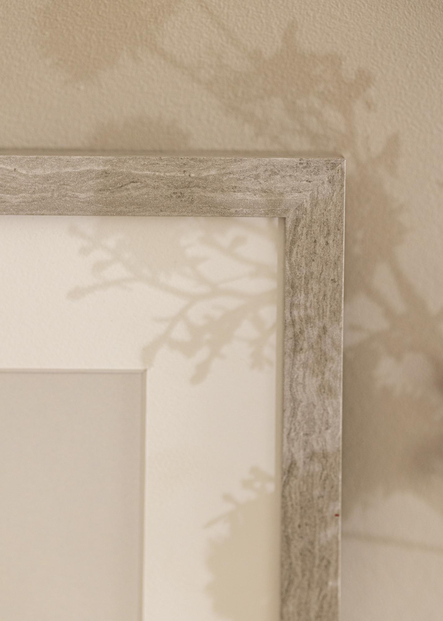 Această ramă de tablou este fabricată din MDF și are o suprafață mată, folie gri cu o frumoasă textură de lemn. Sticla ramei este sticlă adevărată. Imaginile și passepartout-urile sunt montate din spatele ramei. Doar răsucește clemele metalice care țin spatele și apoi plasează motivele tale.