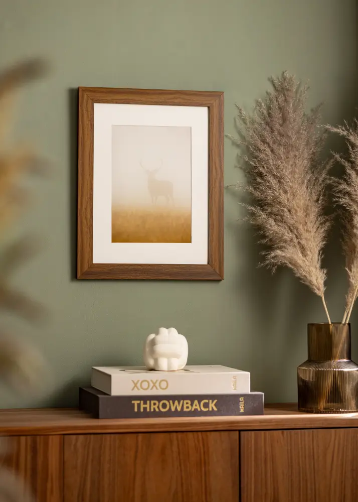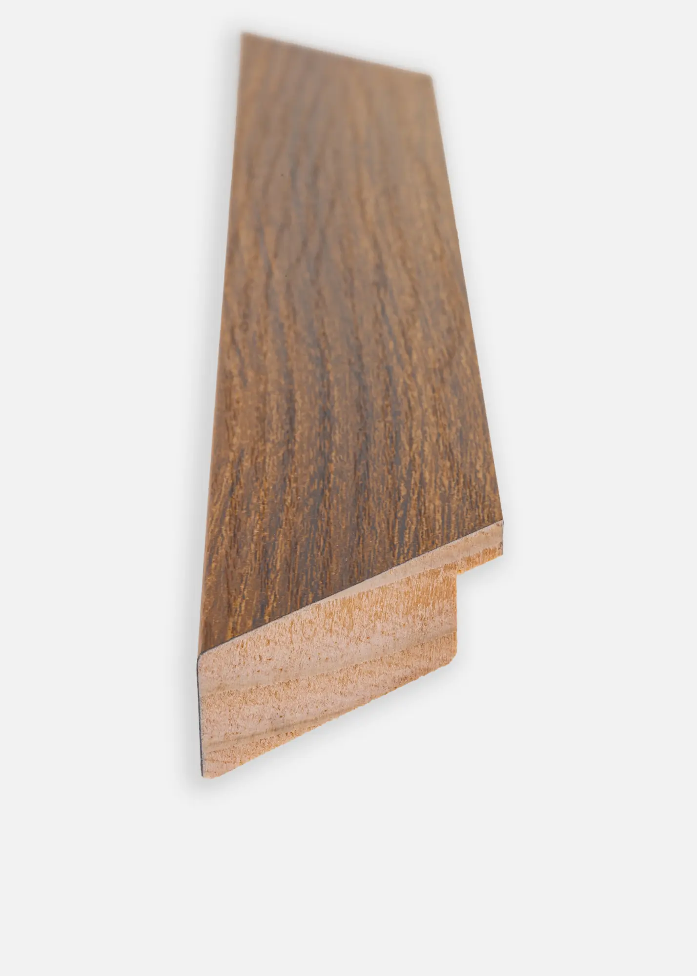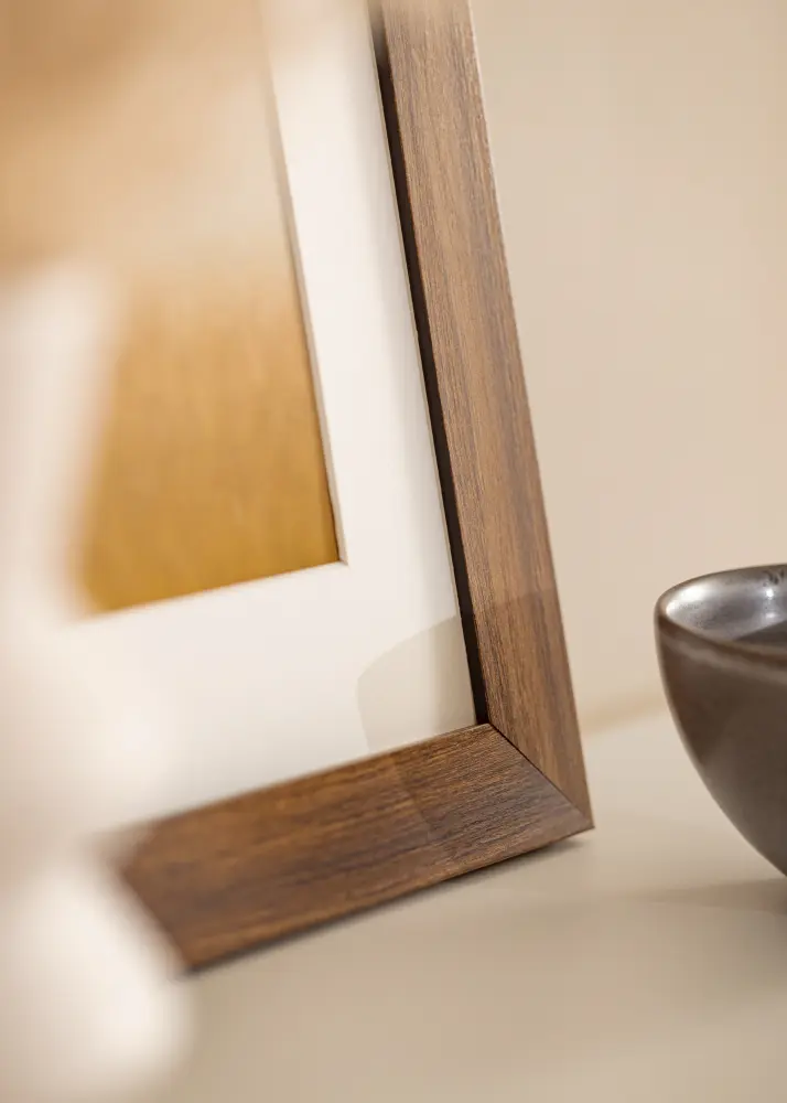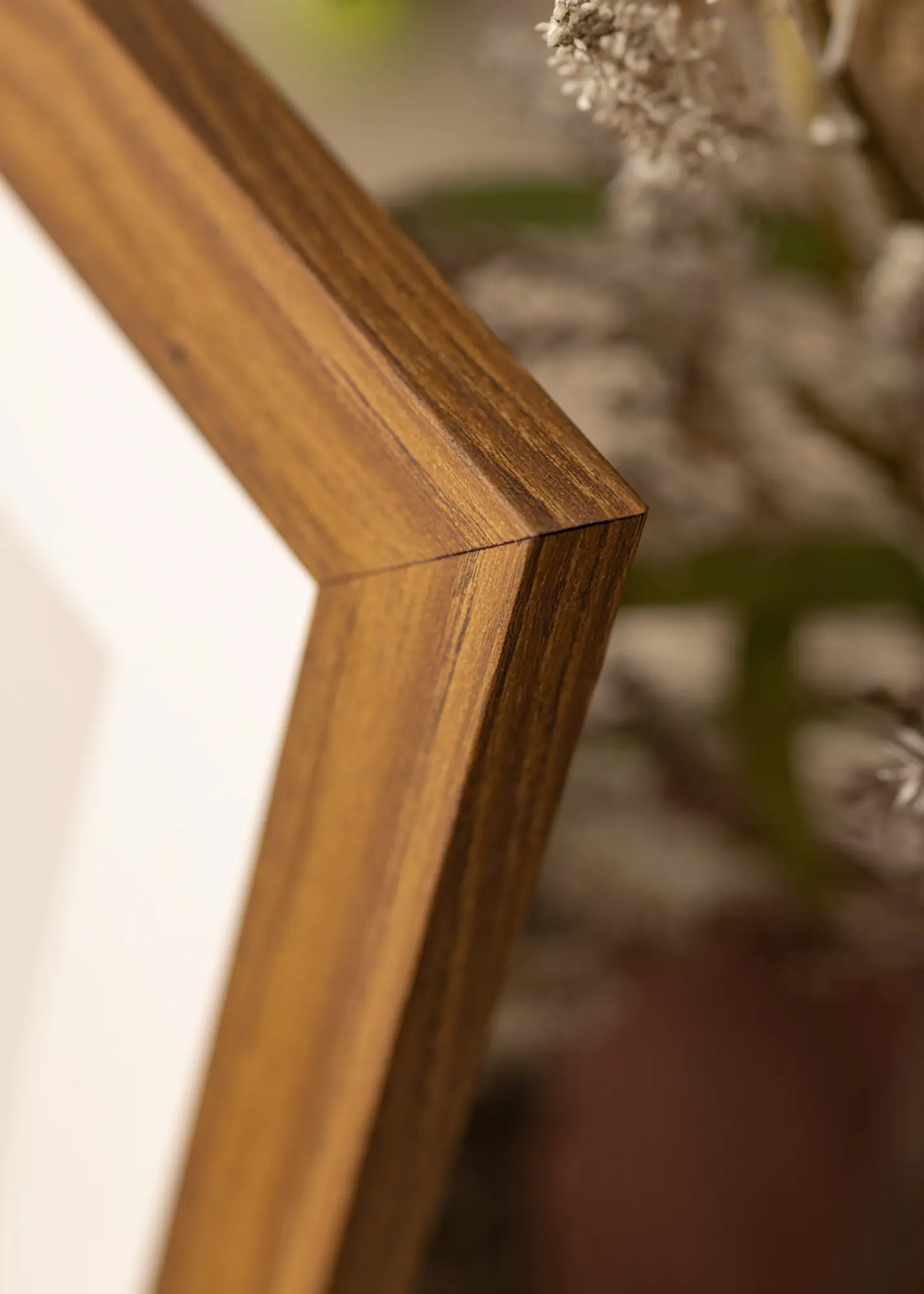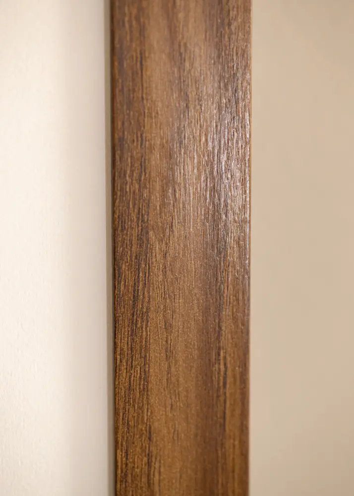 Cadru din lemn de pin cu degete fermecat de culoare maronie deschis lăcuit, cu un profil larg de 40 mm care oferă o senzație exclusivă și se potrivește excelent pentru înrămarea motivelor mai mari.