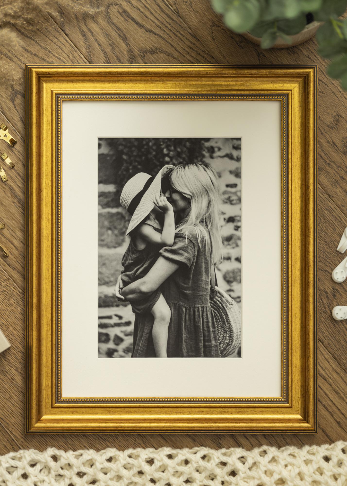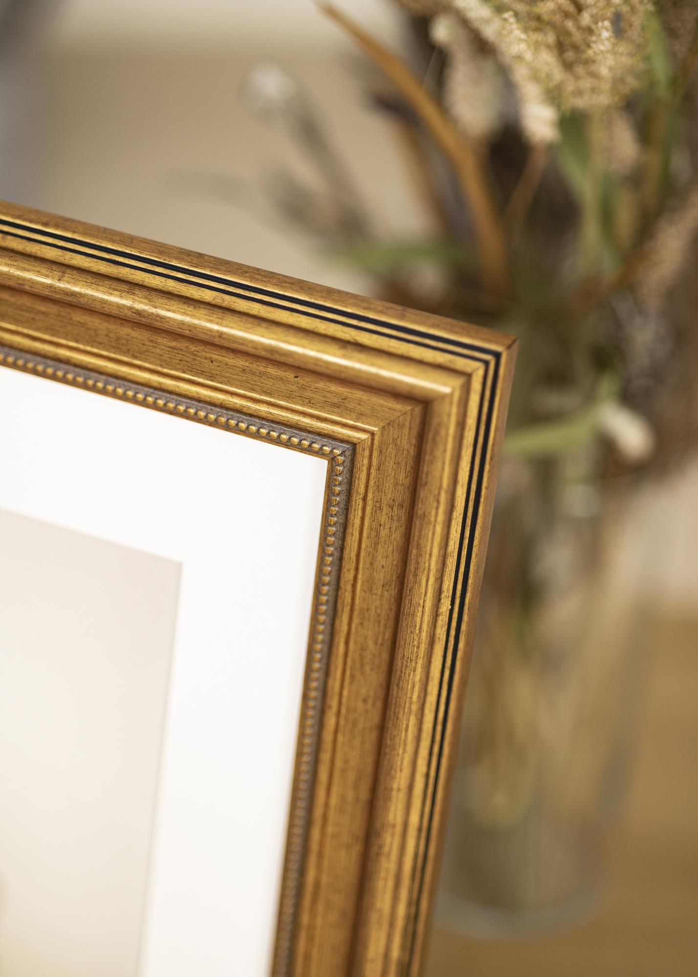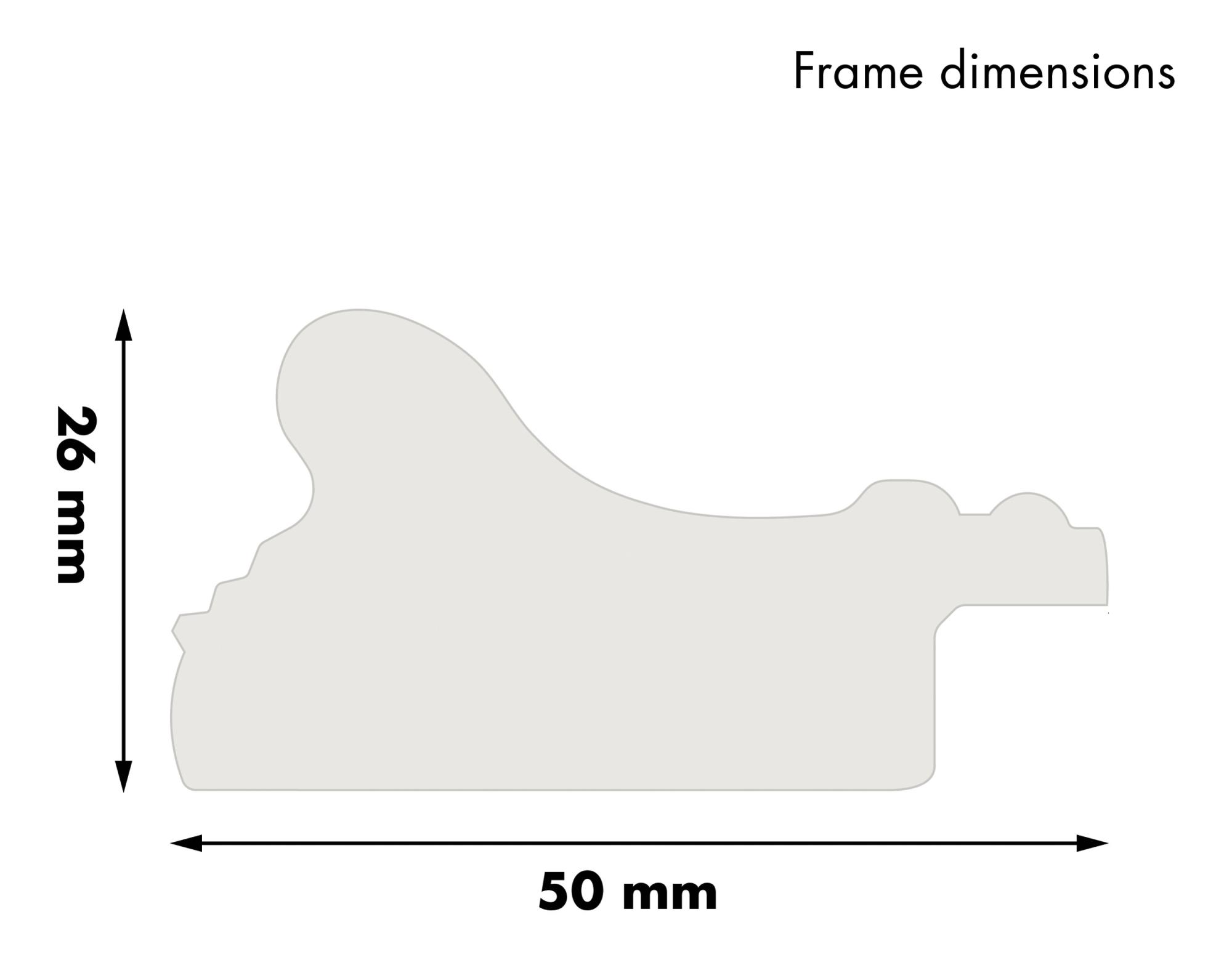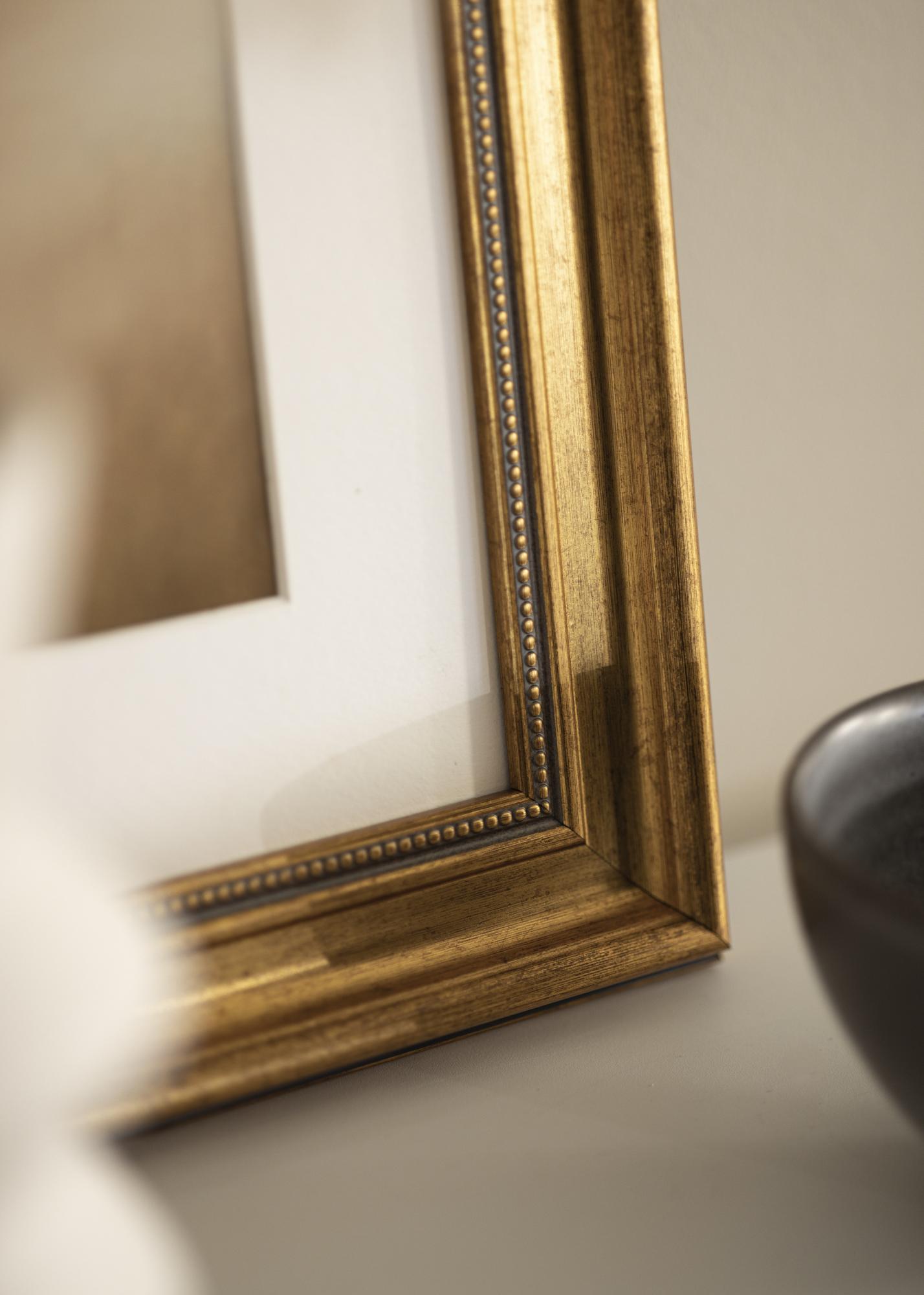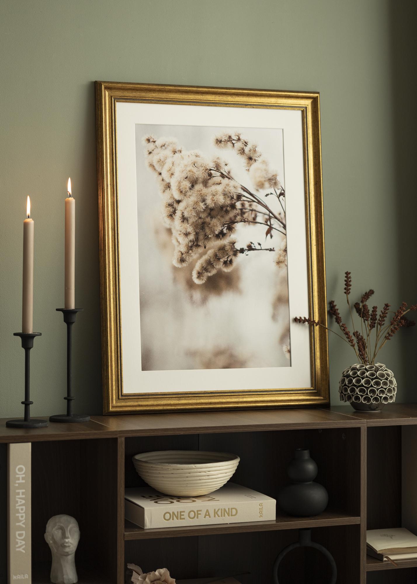 Rokoko este o ramă aurie care oferă o senzație minunată de vintage tuturor motivelor tale preferate. Rama are o listă de ramă lată de 50 mm într-o nuanță de aur antic strălucitor și o suprafață frumos uzată care accentuează aspectul clasic al ramei. Rama se potrivește atât fotografiilor personale, cât și posterelor abstracte – și indiferent de motivul pe care îl alegi, îl poți monta fără probleme. Doar slăbește spatele ramei, care este ținut în loc de mici pini flexibili, și apoi plasează arta de perete lângă geamul ramei.