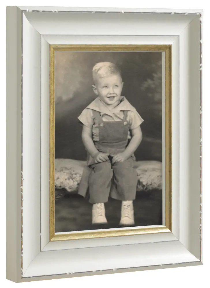 Rame foto în stil clasic cu un sentiment retro captivant. Ramele au un profil uzat în alb cu un detaliu elegant de aur aproape de motiv, cu designul său neutru și alegerea culorilor, aceasta este o ramă care se potrivește în aproape toate mediile și cu toate tipurile de motive.