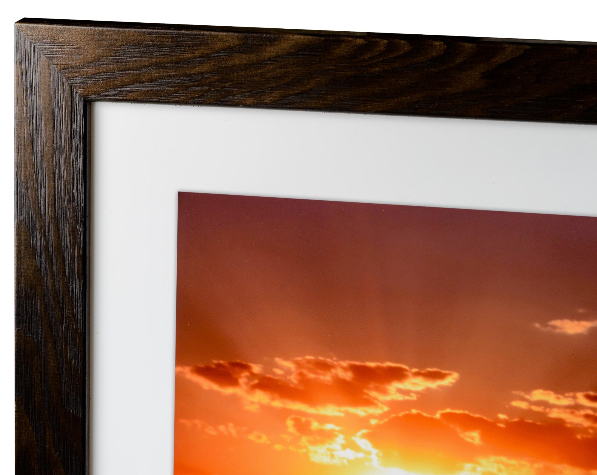 Ramă solidă din lemn maro cu fibre de lemn vizibile și un profil larg. Se potrivește bine atunci când cauți o ramă din lemn închisă la culoare cu un aspect natural. Perfectă pentru imagini de mediu și fotografii de peisaj.