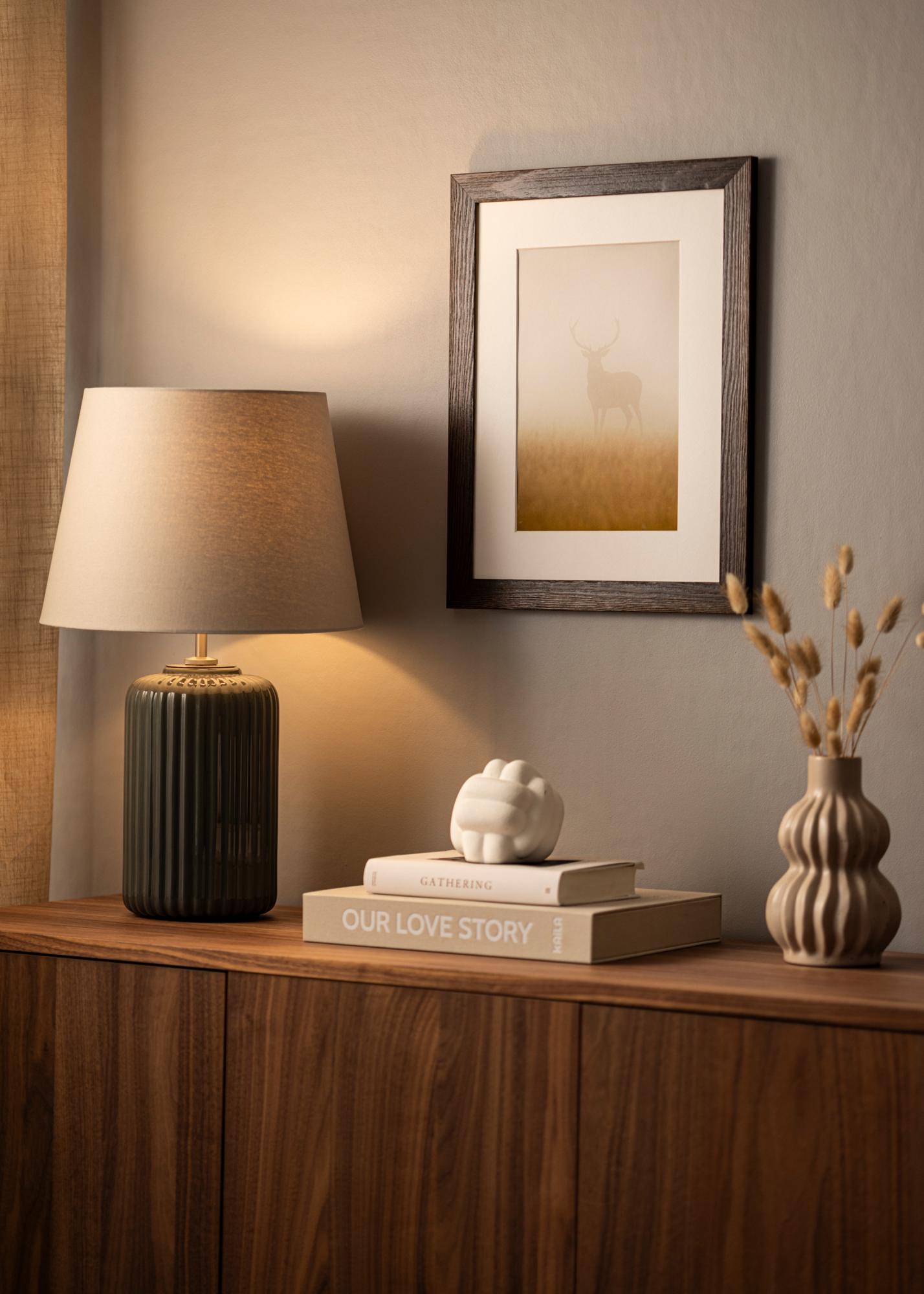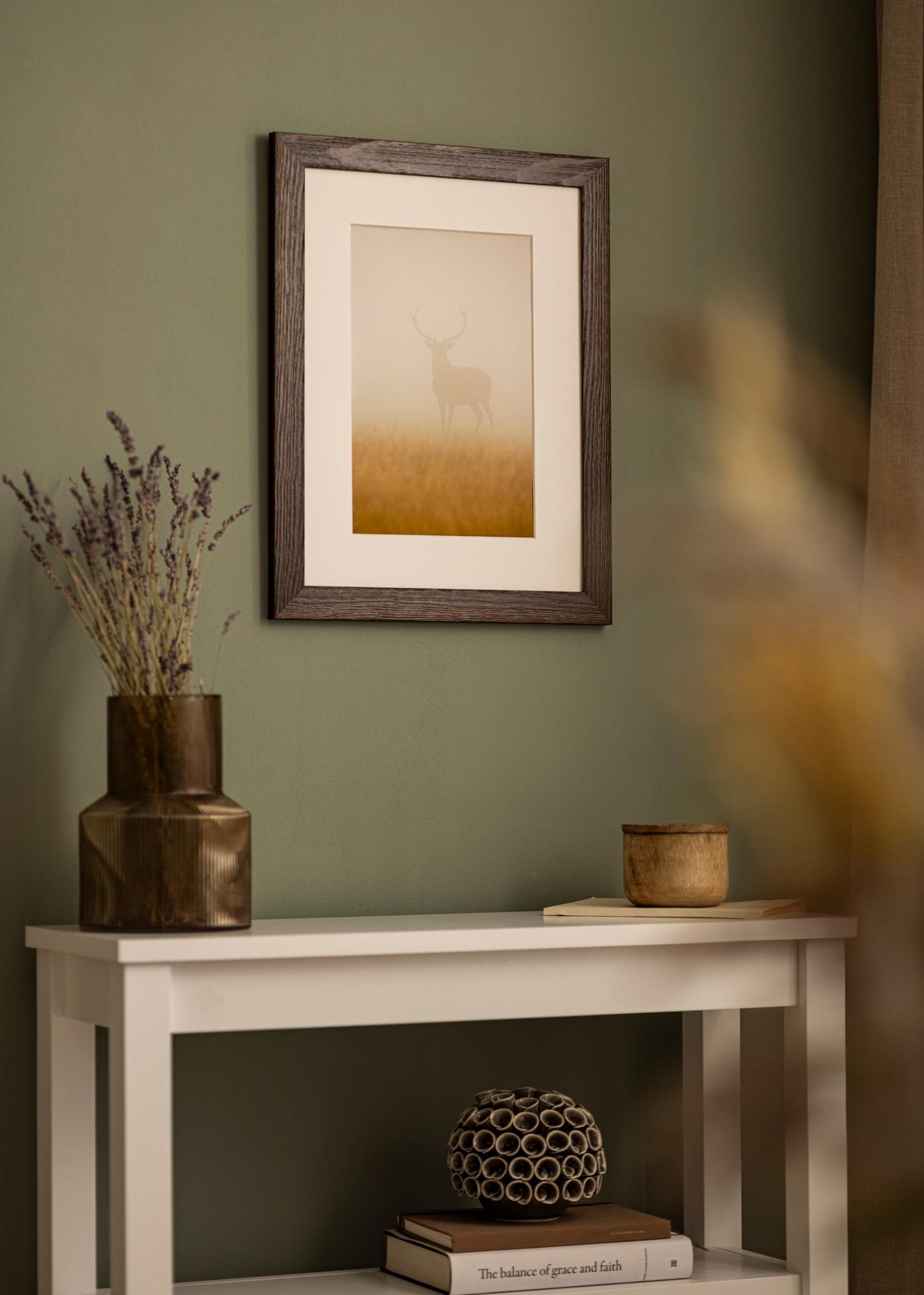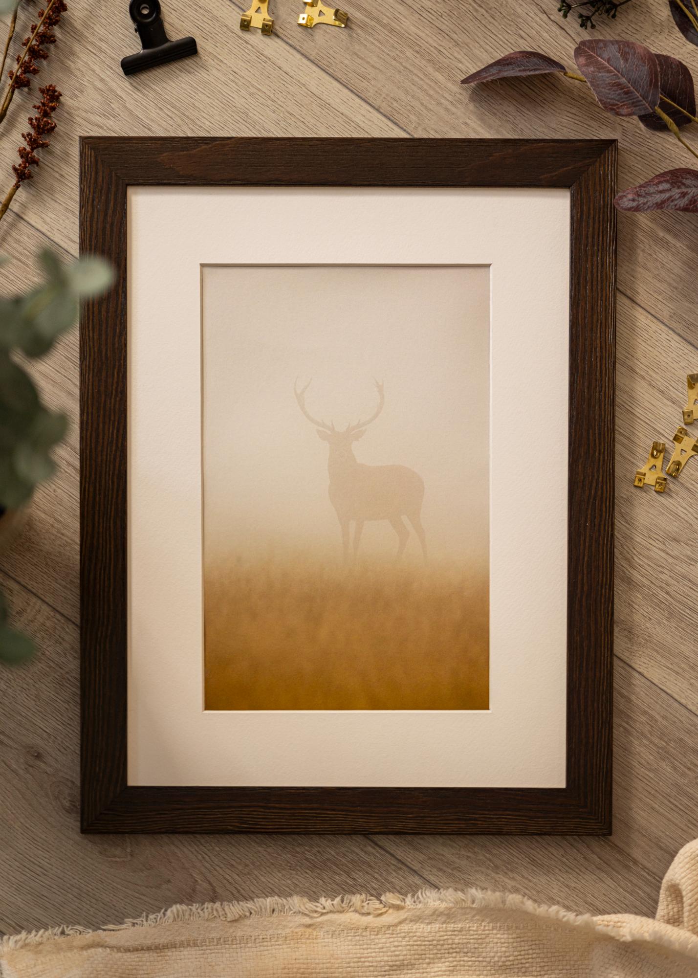 Cadru solid din lemn maro cu fibre vizibile și un profil lat. Se potrivește bine atunci când cauți un cadru de lemn închis cu un aspect natural. Perfect pentru imagini de mediu și imagini de peisaj.