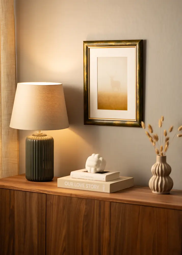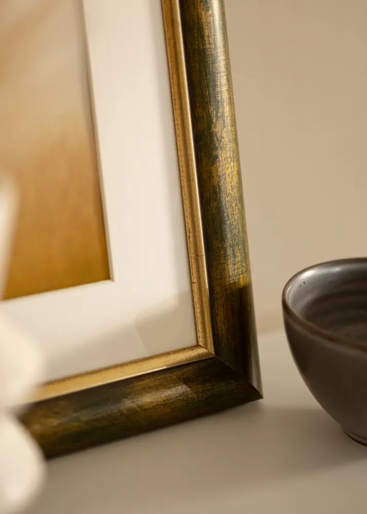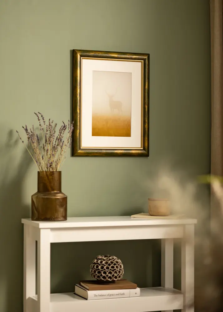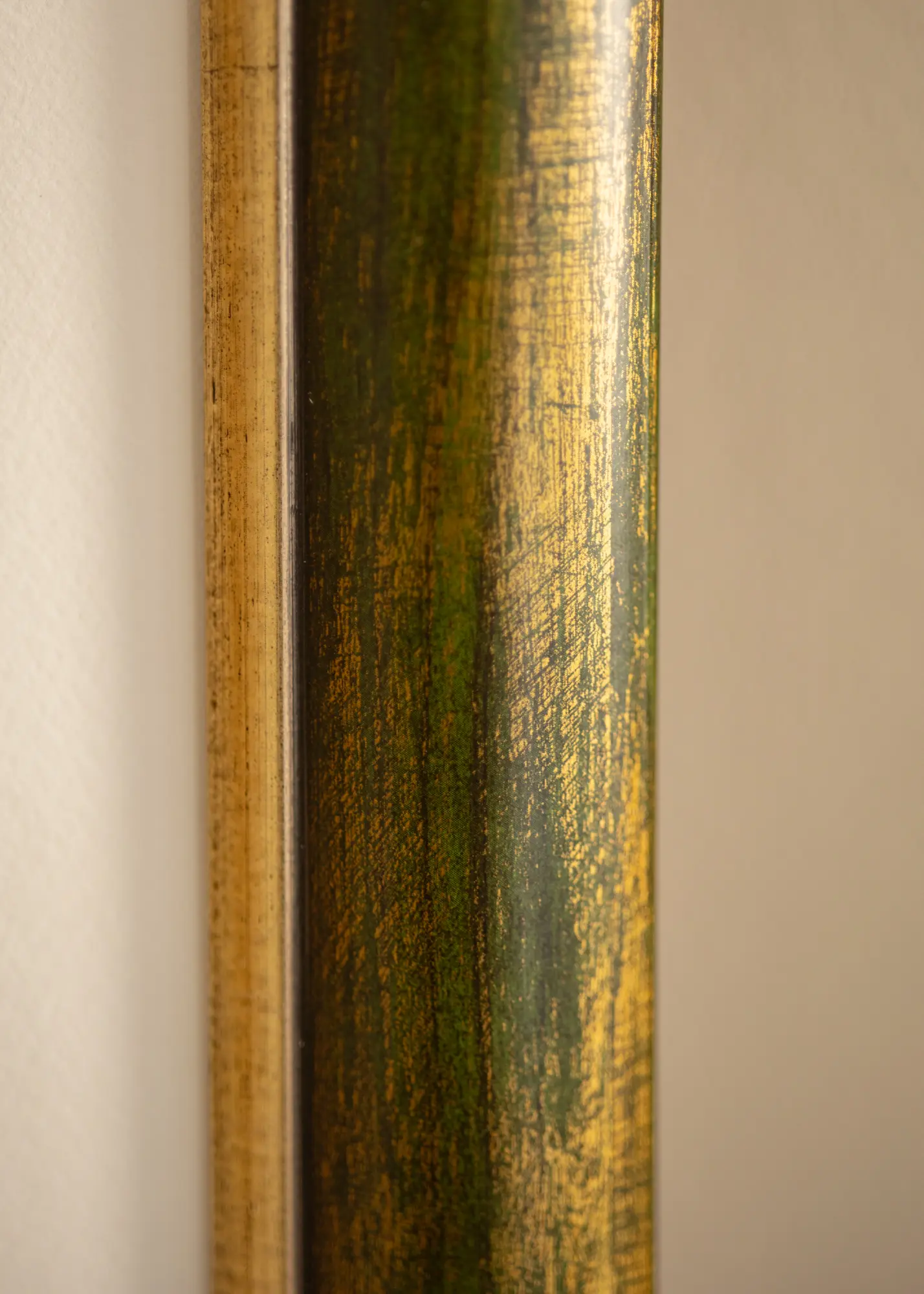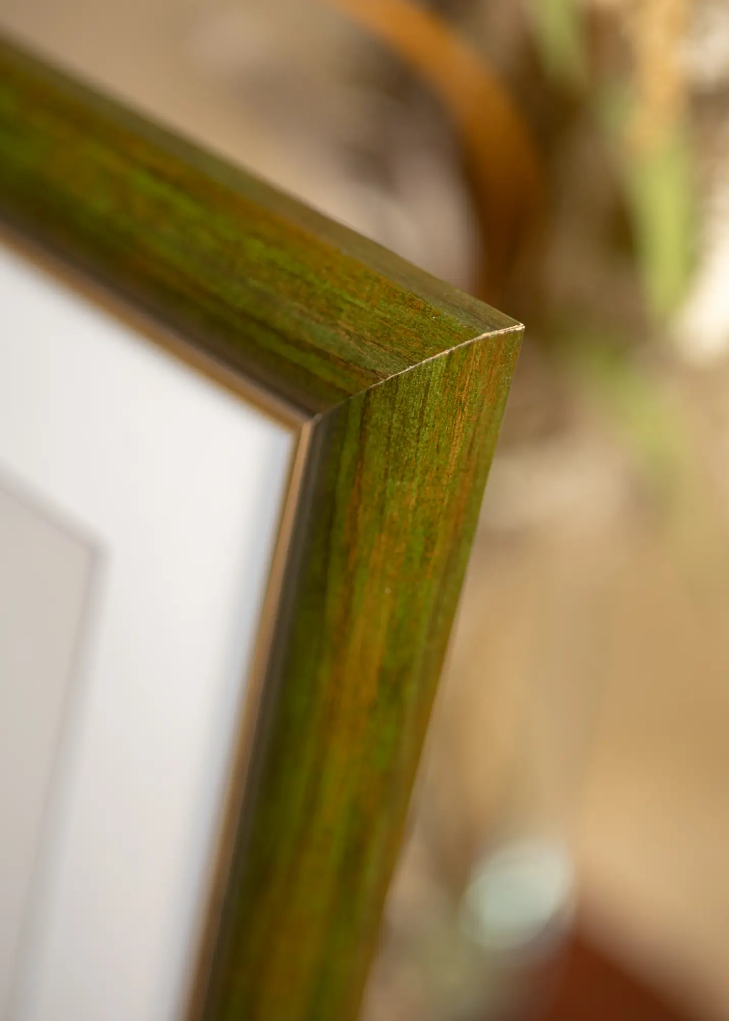 Cadru de lemn atemporal, fabricat în Finland, cu o suprafață de lemn elegantă de culoare verde și cu o margine aurie aproape de motiv. Oferă o senzație armonioasă motivului. Cadrul are un profil larg de 41 mm și o adâncime de 19 mm, ceea ce adaugă un plus de adâncime încadrarei.