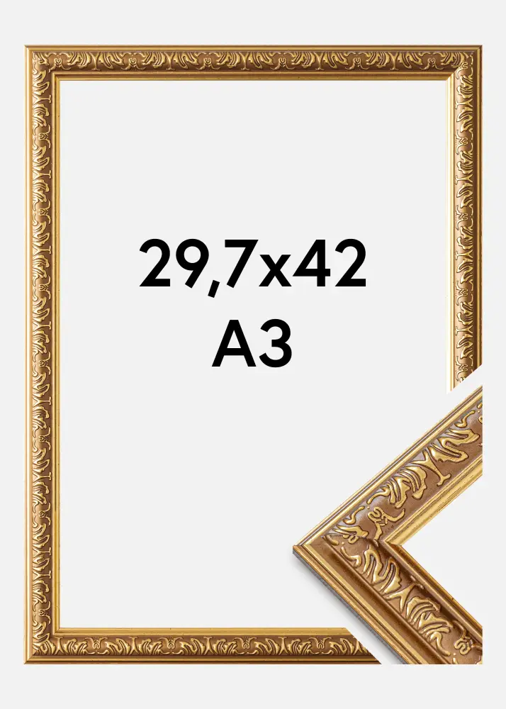 Rama de 28 mm lățime, în culoarea aurului, are detalii ornamentale decorative care oferă un sentiment tradițional și atemporal. Modelele intricate de-a lungul marginii interioare îi accentuează aspectul sofisticat, făcând-o ideală pentru stiluri de decorare clasice și elegante. Cu o adâncime de 20 mm, rama oferă o încadrare stabilă și robustă pentru fotografiile tale.