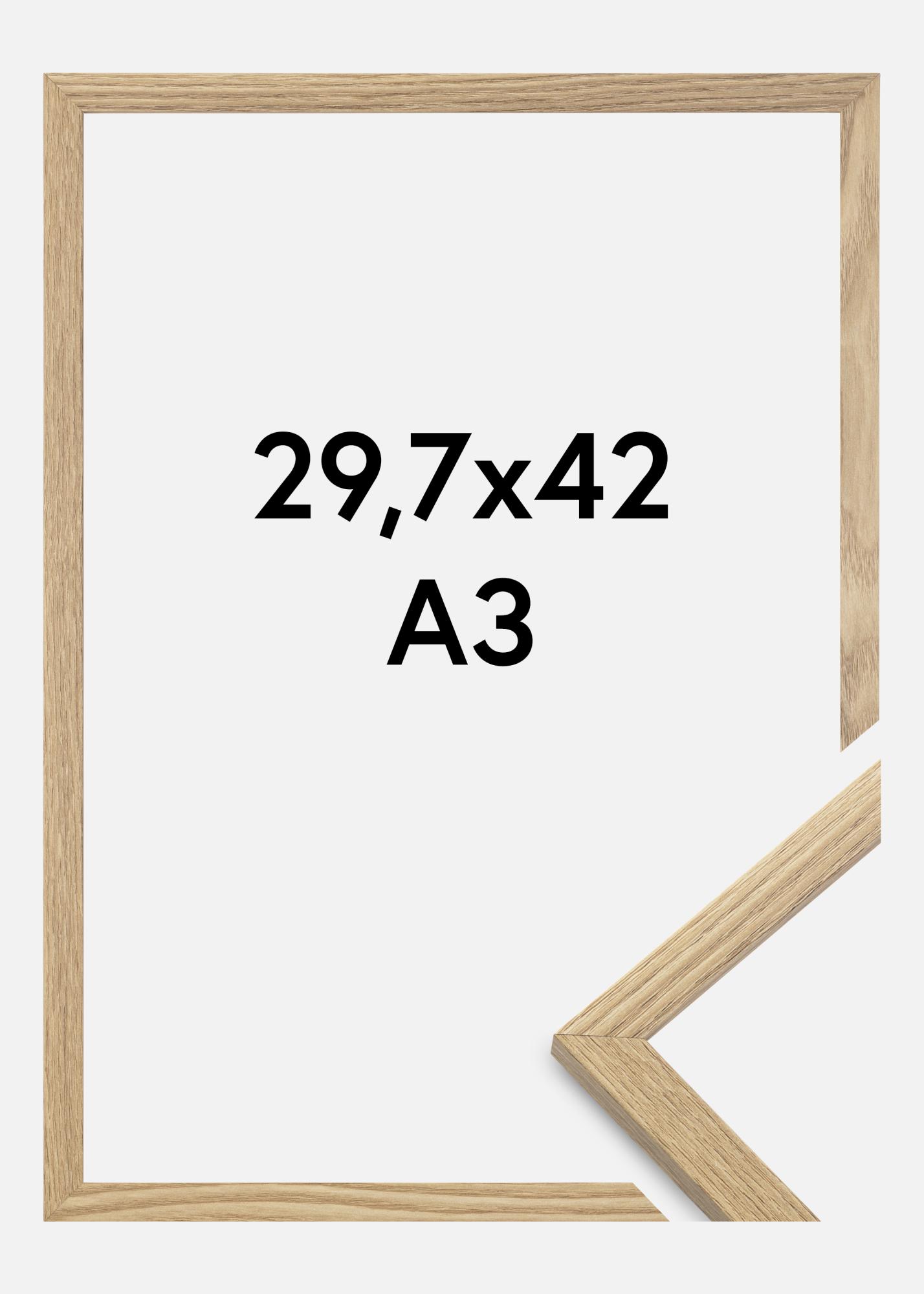 Rama este fabricată din material MDF cu o suprafață foliata de culoarea stejarului și are un profil de ramă subțire de 14 mm. Există suficient spațiu pentru a completa imaginile tale cu un passepartout de lux, datorită adâncimii interioare (adâncimea falsă) a ramei de 12 mm.