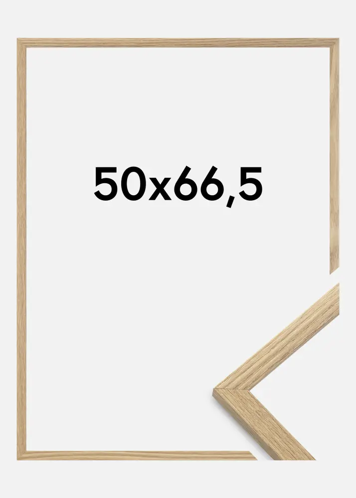 Rama este fabricată din material MDF cu o suprafață laminată de culoarea stejarului și are un profil subțire al ramei de 15 mm. Există suficient spațiu pentru a completa imaginile tale cu un passepartout luxos, datorită adâncimii interioare a ramei (adâncimea tașeului) de 9,5 mm.