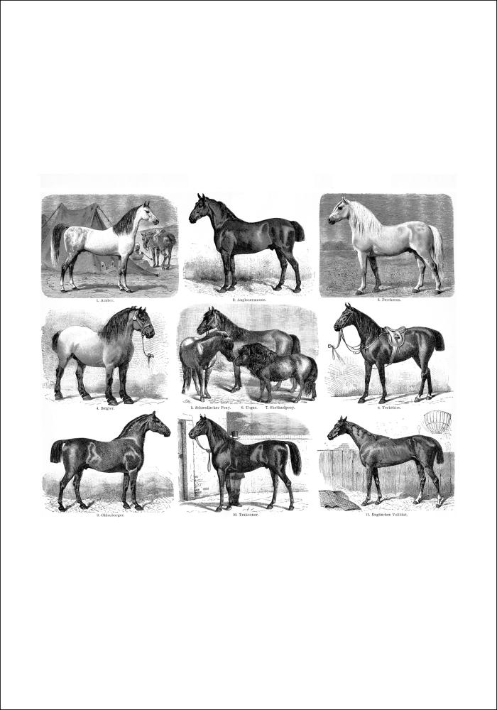 Dacă nu te poți sătura de cai, avem aici un poster frumos cu un motiv ce reprezintă diferite rase de cai. Sub fiecare imagine vei găsi numele raselor scrise în engleză. Deoarece posterul este alb-negru, este ușor de combinat cu o ramă într-o culoare frumoasă. Posterul este disponibil în mai multe dimensiuni care se potrivesc atât pentru a fi așezate pe o comodă, cât și pentru a fi agățate pe perete.