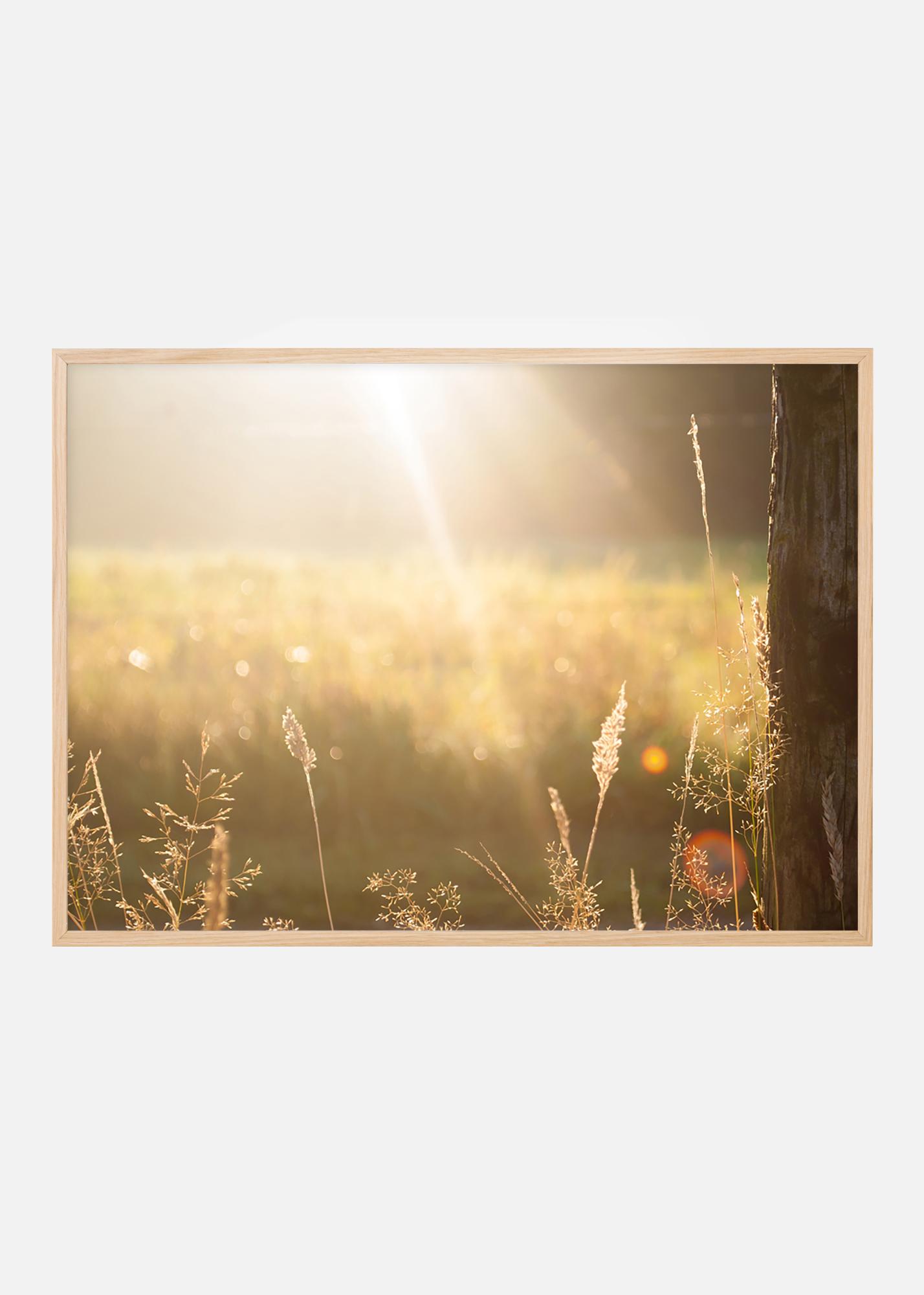 Afiș cu o fotografie în contralumină în nuanțe sepia, pe un câmp de sfârșit de vară, cu fire de iarbă în prim-plan. Motivul este liniștit și aproape că se poate auzi sunetul lăcustelor în seara blândă de vară. Posterul se potrivește bine în toate tipurile de stiluri de interior, cu paleta sa de culori temperată, și arată frumos atunci când este agățat alături de alte motive naturale.