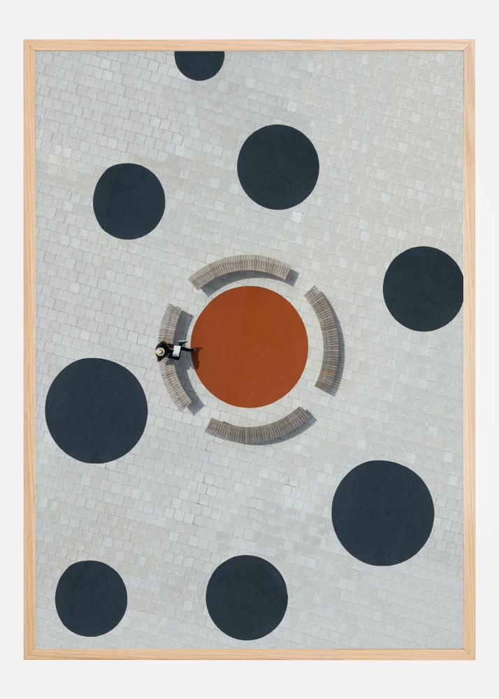 Această poster conceptual captează o imagine distinctă, din perspectivă aeriană, a unei persoane care citește, înconjurată de o compoziție simetrică și grafică. Designul abstract al suprafeței placate alb, punctată cu cercuri mari negre și un cerc central roșu-ruginiu cu bănci, oferă un contrast vizual puternic. Acest afiș nu este doar un omagiu adus designului și arhitecturii, ci și o interpretare jucăușă a scenelor cotidiene.