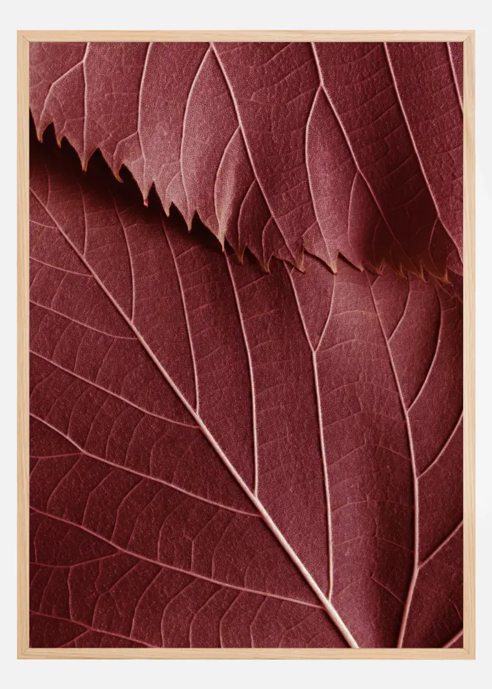 Fotografie botanică a frunzelor roșu-închis cu modele vii. Un poster elegant în nuanțe calde într-un stil care îl face perfect pentru a fi combinat cu alte motive minunate pe un perete de tablouri mai mare.