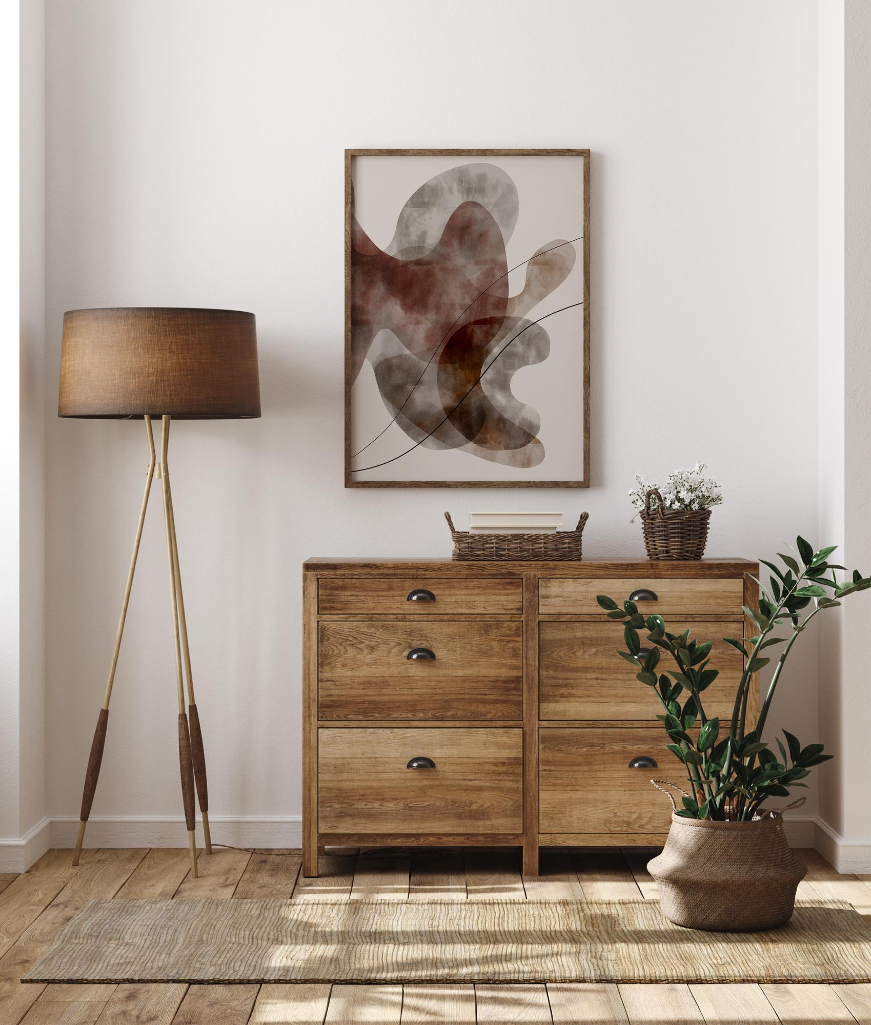 Un poster abstract cu forme ciudate în culori diferite care amintesc de algele marine. Formele sunt umplute cu culori maro, gri, roz și verde moi, cu o nuanță încețoșată. Două linii se răsucesc dramatic peste formele centrale care sunt plasate pe un fundal alb. Combină cu un fundal în culori pastelate moi pentru a crea un subiect de conversație interesant.