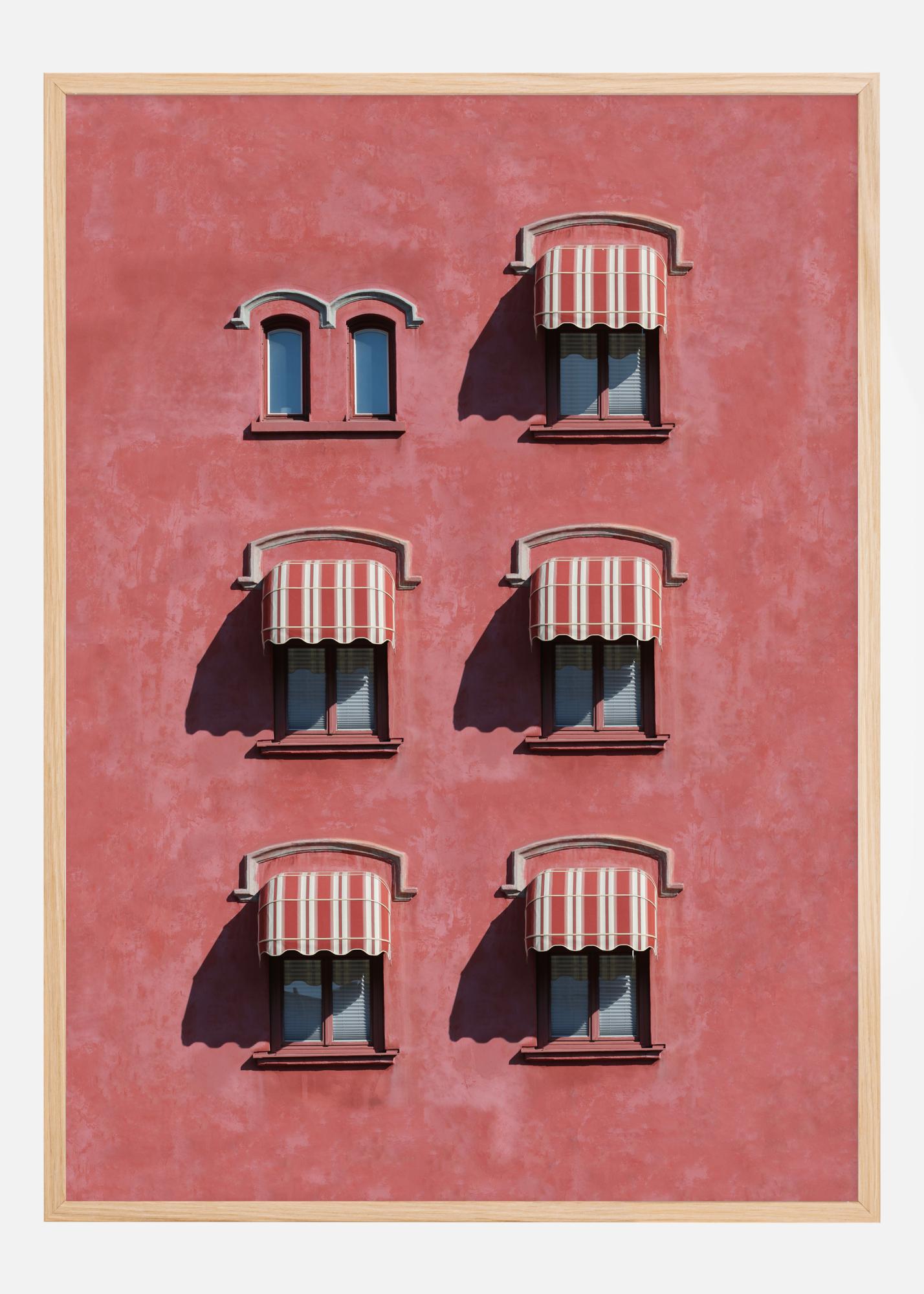 Acest poster elegant și sofisticat, "Red Wall", este o demonstrație de armonie arhitecturală și echilibru vizual. Șase ferestre, fiecare cu o marchiză distinctă, împodobesc fațada roșie vibrantă și oferă o simetrie ritmică care este atât liniștitoare, cât și satisfăcătoare pentru ochi. Jocul jucăuș al soarelui pe suprafață dă viață structurii și creează un joc între lumină și umbră.