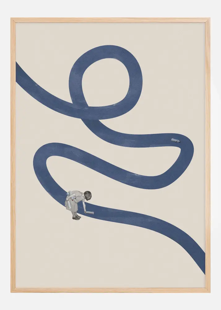 Paleta de culori este simplă dar puternică, cu un fundal curat bej care contrastează cu bucla albastru închis. Această combinație de culori este atât liniștitoare, cât și concentrantă, ceea ce face din imagine un complement excelent pentru spațiile care încurajează reflecția, cum ar fi o bibliotecă, birou sau retragere. Este o poveste vizuală despre navigarea complexității vieții cu hotărâre și speranță.