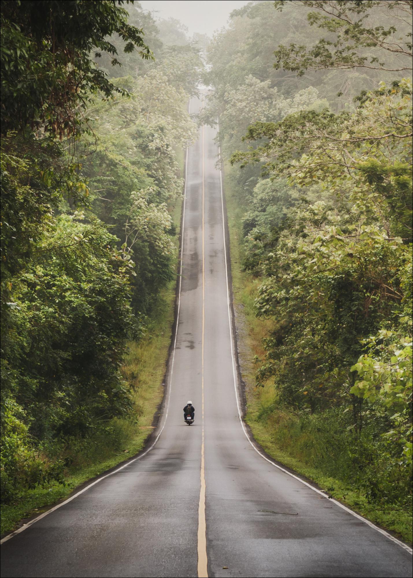 O fotografie natura liniștită a unui drum cu un motociclist singuratic care traversează o verdeață luxuriantă minunată. Un poster calmant și liniștitor, care se potrivește excelent alături de alte favorite pe un perete mai mare de tablouri.