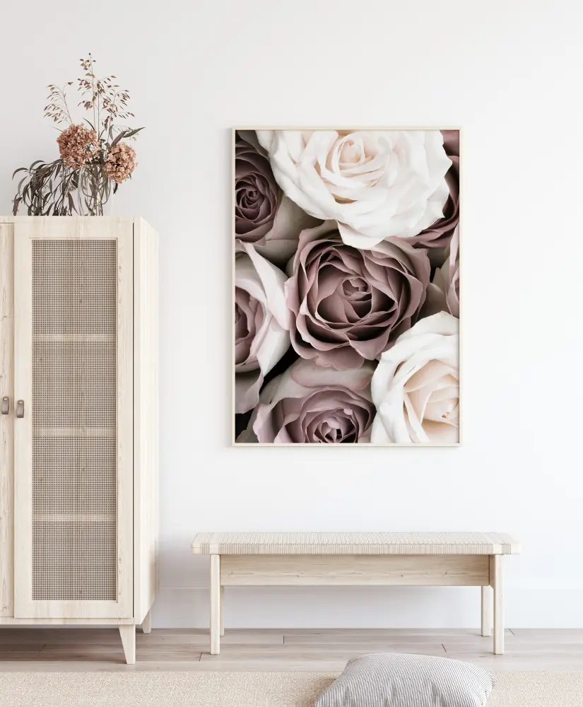 Un poster cu prim-plan cu cinci trandafiri colorați diferit. Obiectivul surprinde fiecare petală individuală în timp ce se mișcă unul în jurul celuilalt, creând forma caracteristică a trandafirului. Petalele sunt roz, albe și roșii în tonuri și nuanțe subtile. Florile oferă o senzație minunată de primăvară.
