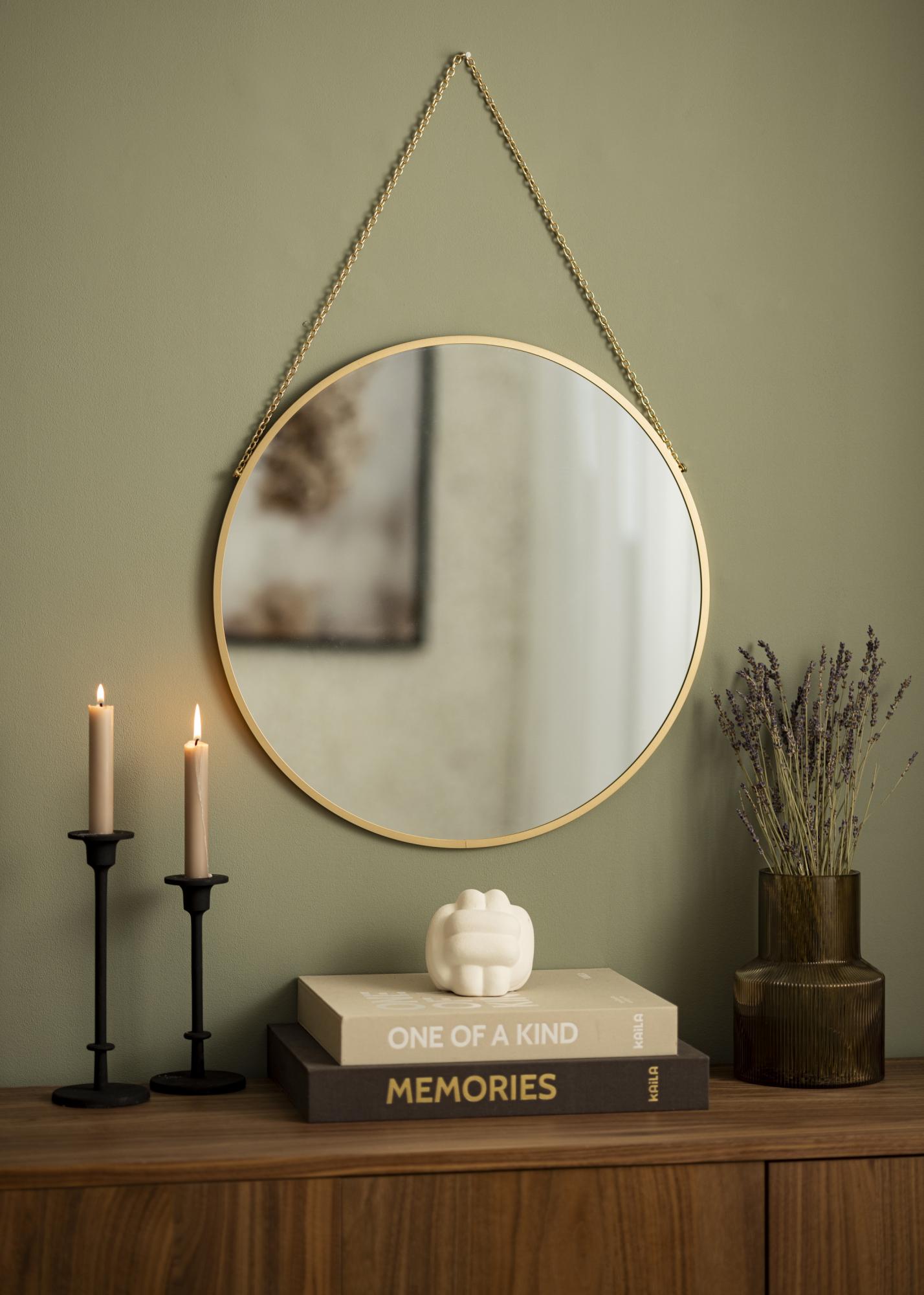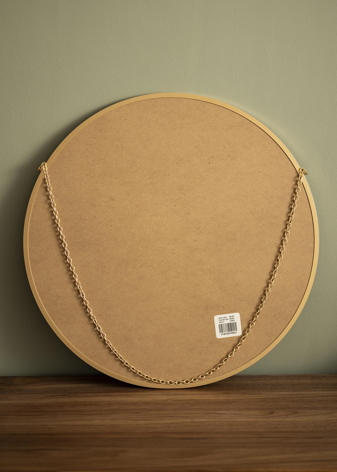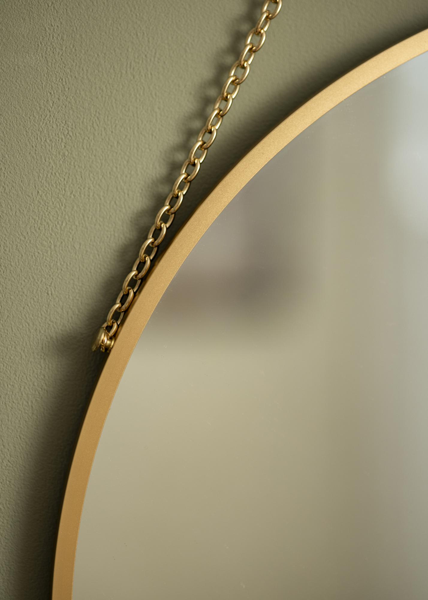 Lasă această oglindă de perete să adauge eleganță în casa ta! Oglinda are un aspect sofisticat cu o formă rotundă și o ramă subțire de oglindă cu o adâncime de doar 8 mm. Rama delicată este fabricată din metal și are o culoare aurie exclusivistă. Impresia elegantă este completată de lanțul auriu utilizat pentru agățare.