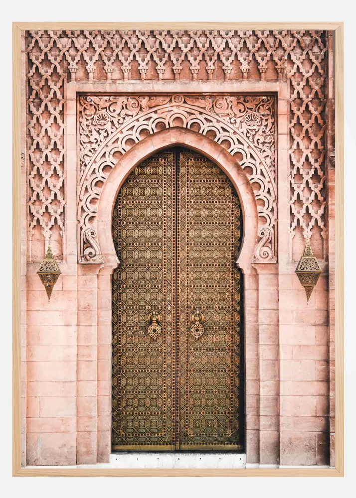Un poster arhitectural cu o ușă mare sau o intrare regală. Pereții căptușiți cu plăci roșii sunt proiectați în mod elaborat, unde înconjoară curburile ușilor aurii. Imaginează-ți ce se află în spatele acestor uși aurii când aduci această imprimare fantastică în casa ta.
