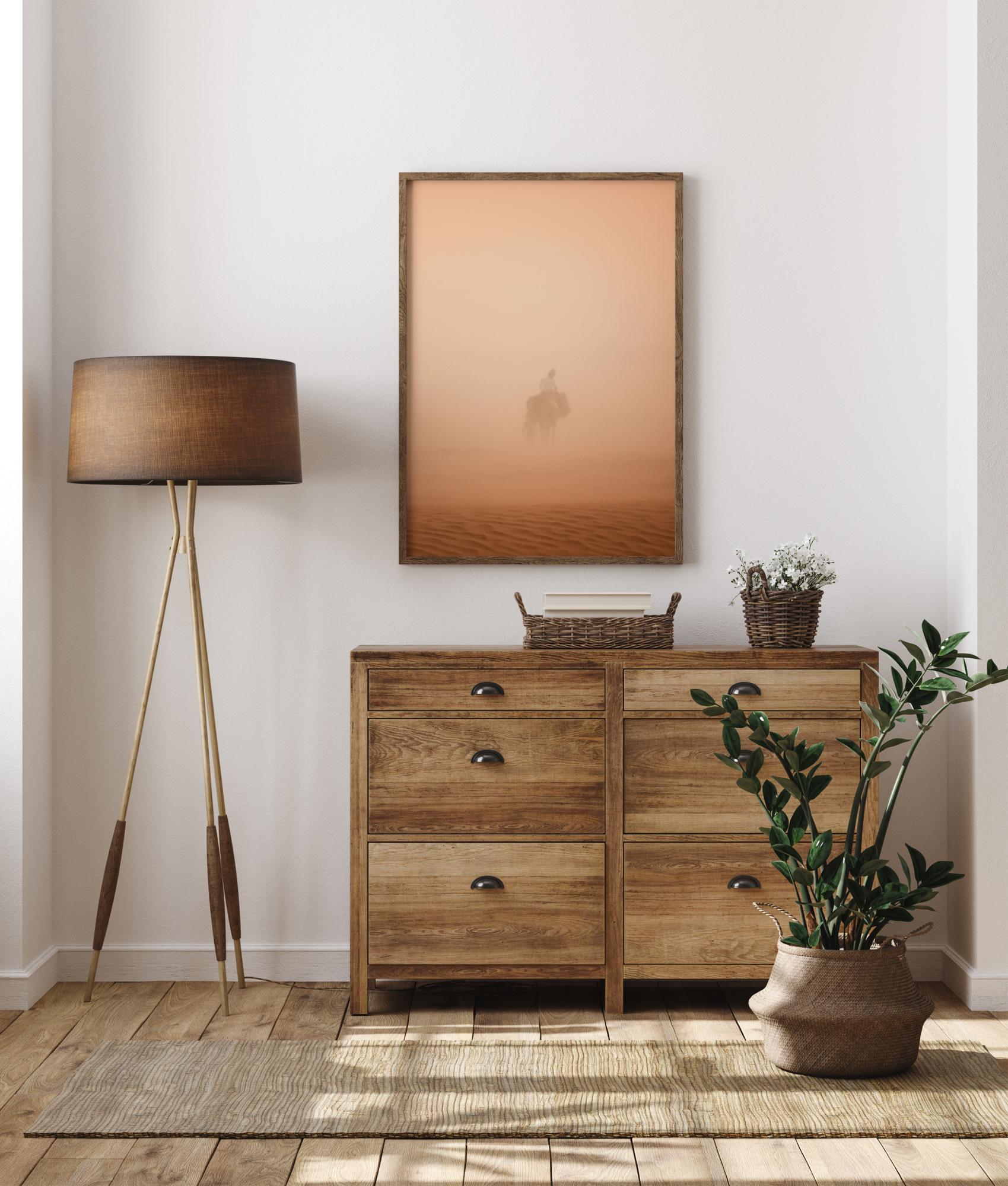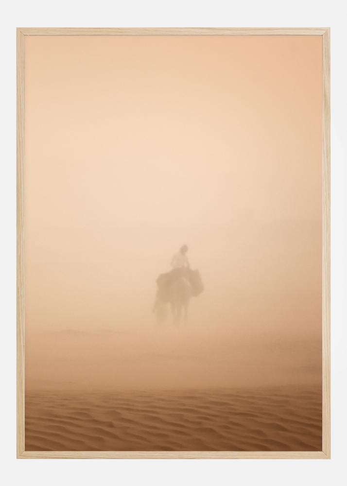 Un poster cald cu o furtună de nisip. Nisipul deșertului poate fi văzut în prim-plan înainte de a se pierde într-o ceață vârtej de culori moi. În mijloc se distinge forma slabă a unei figuri care călărește și luptă în furtună. Simți căldura deșertului.