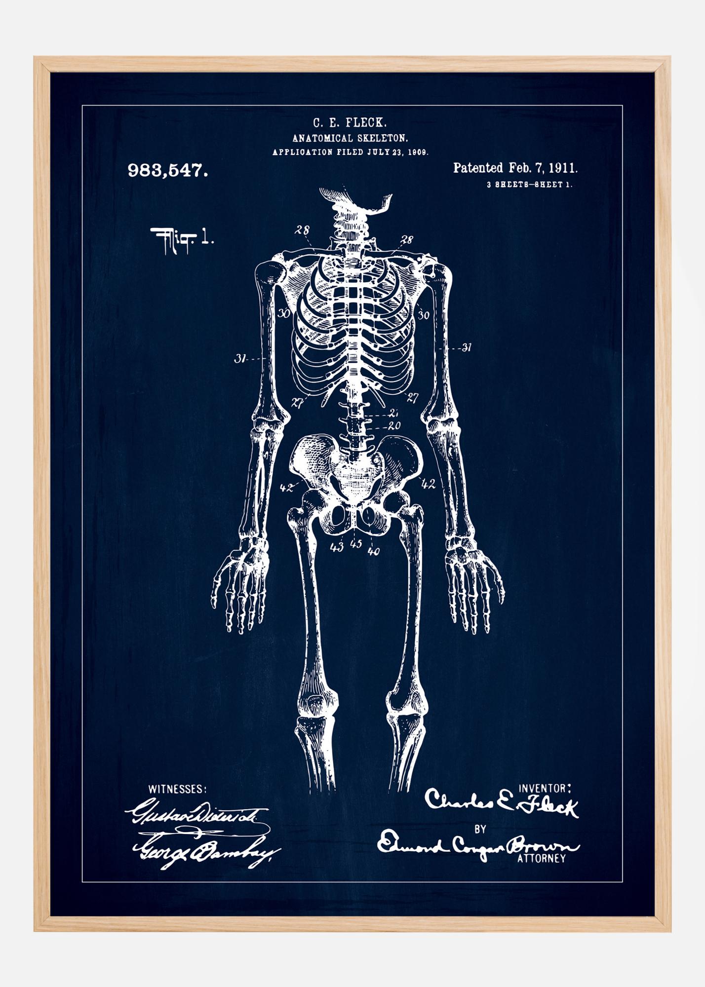 Această impresionantă poster de brevet prezintă brevetul numărul 983,547, acordat pe 7 februarie 1911, și reprezintă un model de schelet anatomic, creat de C. E. Fleck. Contururile albe clare pe fundalul întunecat ilustrează anatomia umană cu o combinație de precizie și estetică artistică, evidențiind fiecare os și structură importantă a scheletului.