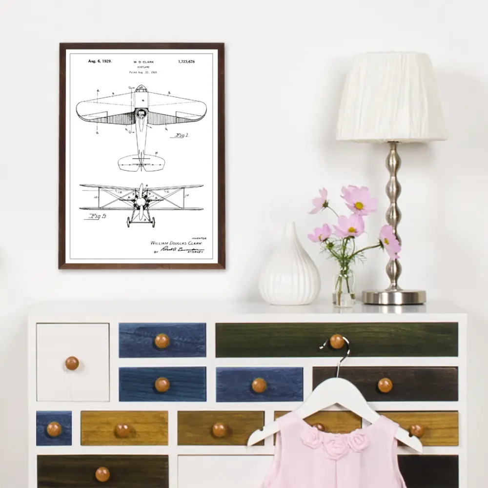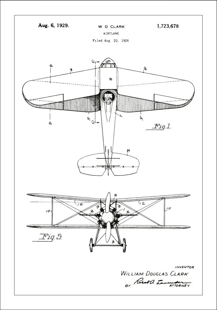 Cu o simplitate clasică, acest poster cu brevet captează designul de avion al lui W D Clark, un design care întruchipează spiritul aviației timpurii. Brevetul a fost acordat pe 6 august 1929 cu numărul 1,723,678, iar această ilustrație este o capsulă a timpului a inovației. Liniile clare și detaliile ascuțite ale posterului onorează progresele tehnice care au fost cruciale pentru viitorul aviației.