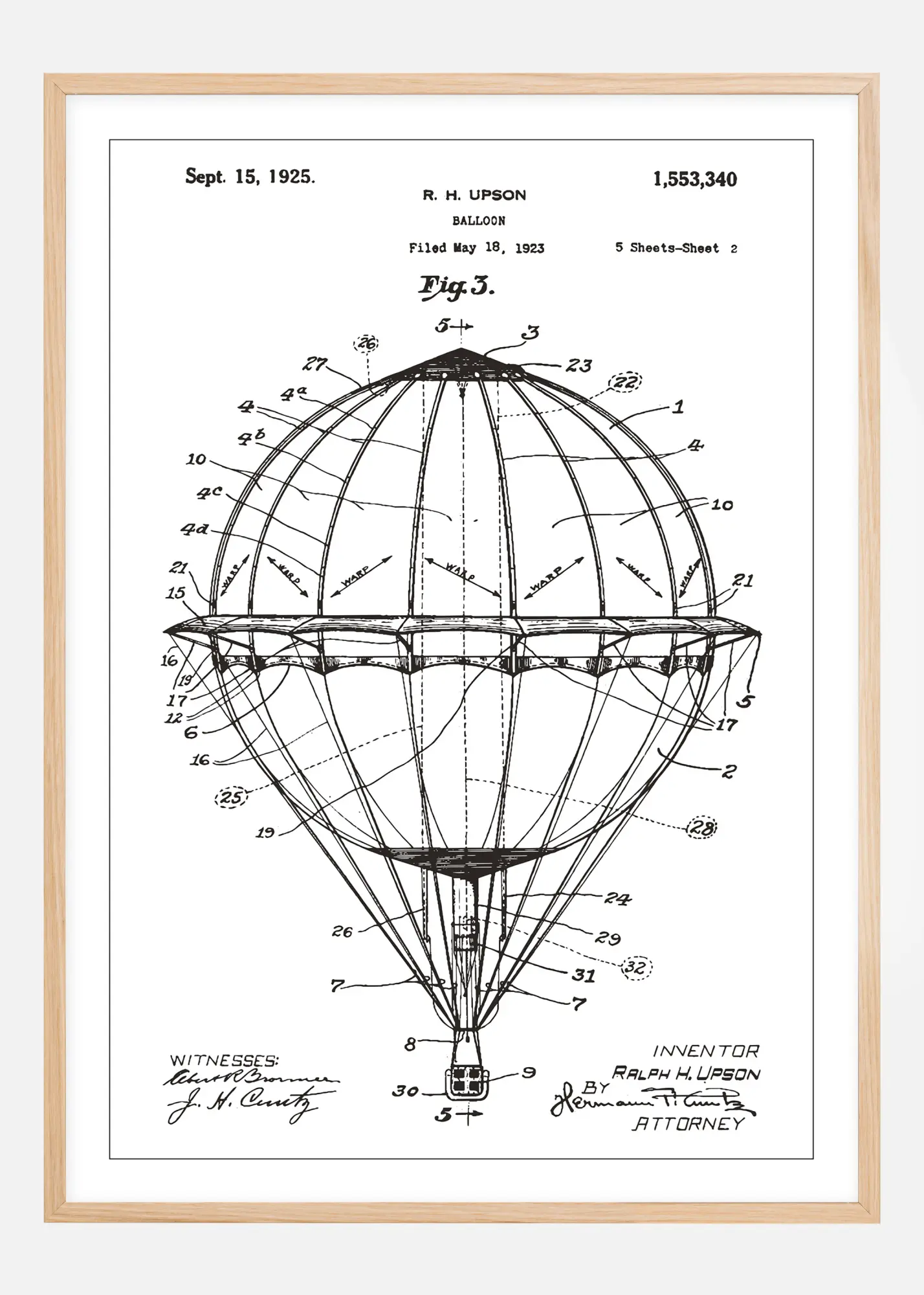 Intrați într-o lume a inovației timpurii cu acest poster exclusiv de brevet care prezintă designul unui balon cu aer, una dintre numeroasele mari invenții ale lui Ralph H. Upson. Brevetul, emis pe 15 septembrie 1925 cu numărul de înregistrare 1.553.340, prezintă un nivel extraordinar de detaliere și genialitate. Este un detaliu artistic perfect pentru cei cu o pasiune pentru istoria aviației și construcții.