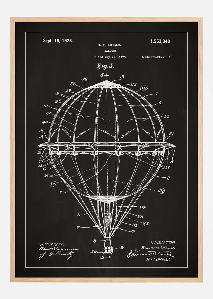 Această poster de brevet realizat în mod unic ilustrează o construcție detaliată a unui balon cu aer cald, al cărui brevet original a fost creat de inovatorul Ralph H. Upson. Brevetat pe 15 septembrie 1925 sub numărul 1,553,340, acesta este un exemplu fascinant de inginerie aerodinamică timpurie. Acest poster de brevet este un omagiu adus visului de a pluti printre nori și dorinței umanității de a explora cerul.